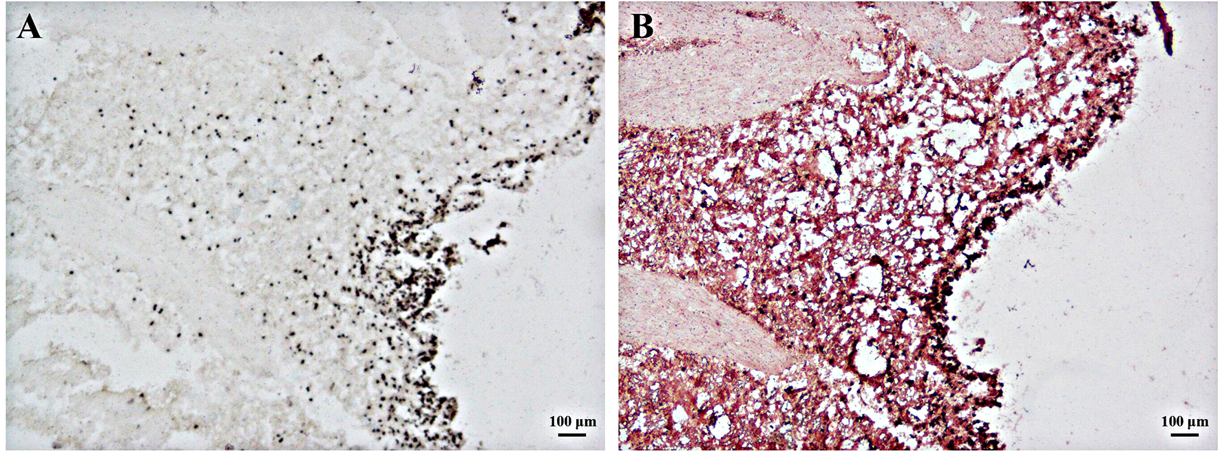 DOPA staining of melanin in frozen-sectioned mantle tissue. (A) DOPA staining of melanin in mantle tissue with (B) and without (A) neutral red counterstaining. Brown or black particles indicate positive results. Bar, 100 μm.