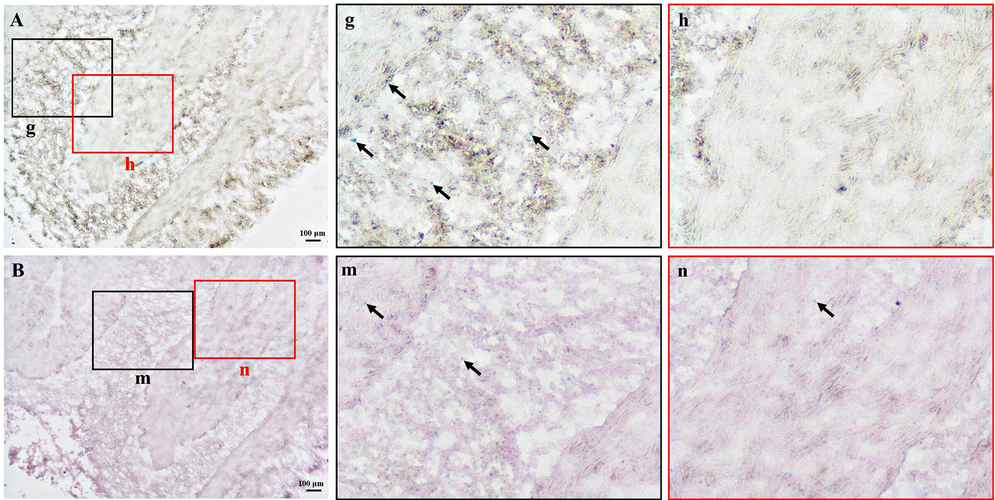 Ferrous sulfate staining of melanin in frozen-sectioned mantle tissue. (A) Ferrous sulfate staining of melanin in mantle tissue with (B) and without (A) nuclear fast red counterstaining. The enlarged area in the black and red boxes corresponding to Figure A or B (g, h, m, n). The green areas (arrow) represent positive results. Bar, 100 μm.