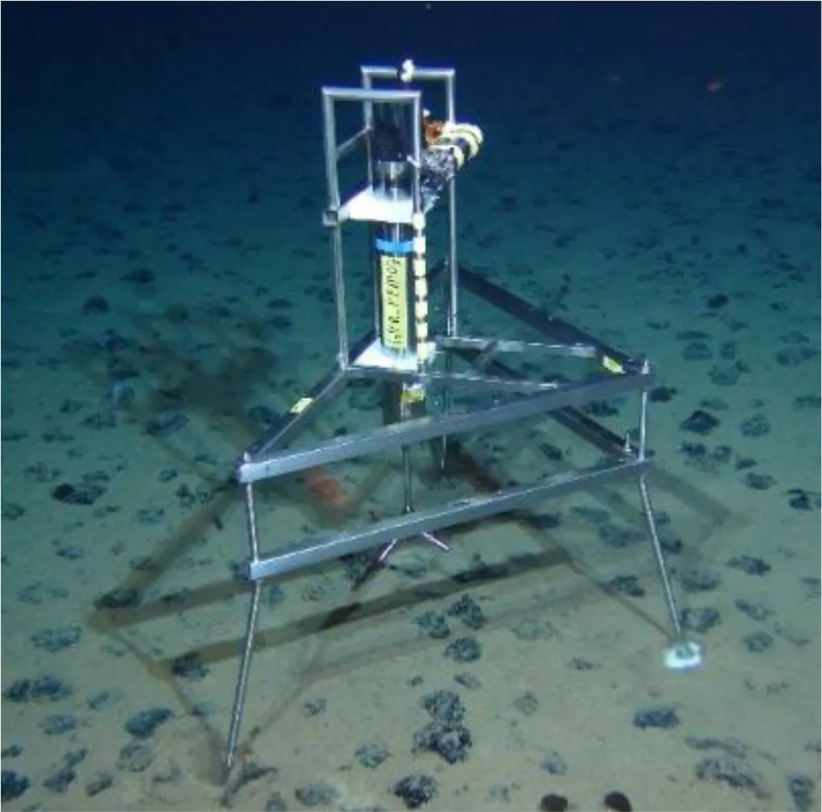 2) Tripods equipped with a Nortek ADV current meter recording current speed and direction, together with a JFE Advantech OBS recording turbidity. GEOMAR deployed two of these platforms, named GMR_PFM-07 and -08.