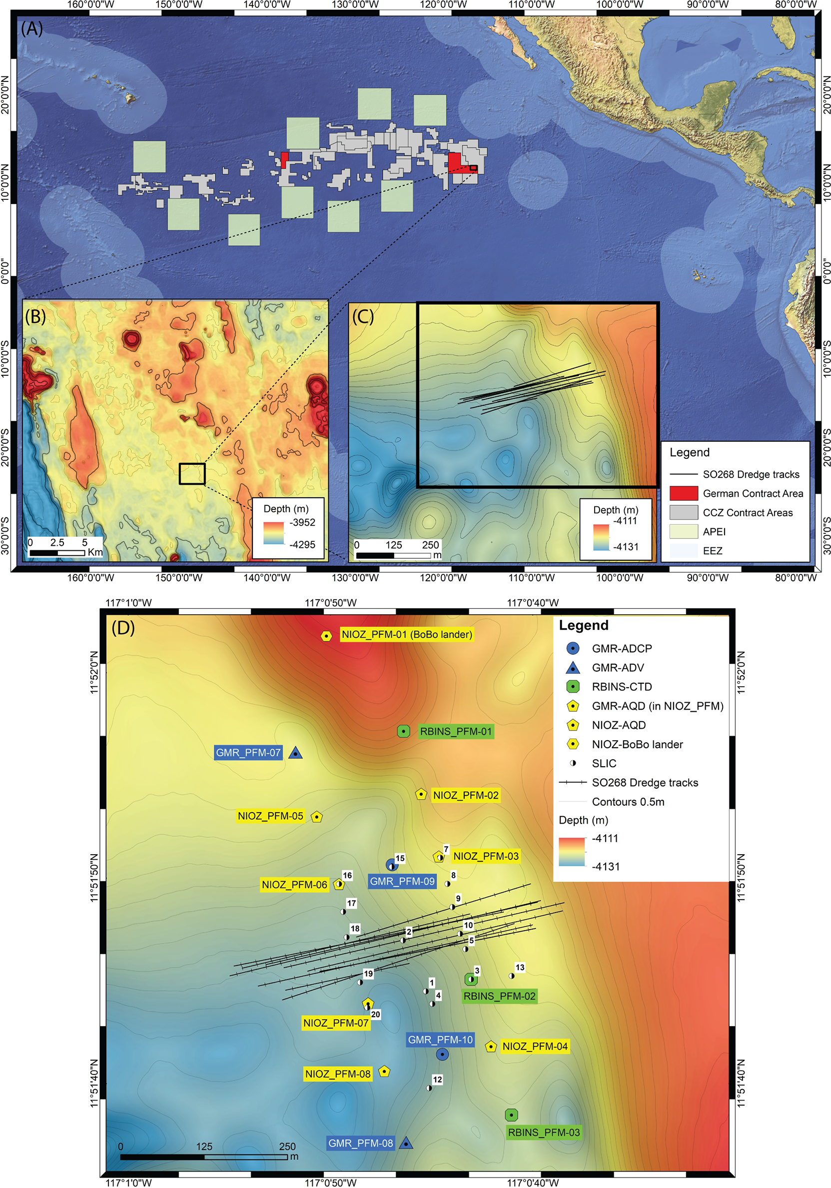 (A) Map showing the overall location of the CCZ with the German exploration contract areas marked in red. The area of the dredge experiment is shown in more detail in the insets (B, C). The abbreviation APEI stands for Area of Particular Environmental Interest (source: https://isa.org.jm) and EEZ stands for Exclusive Economic Zone (source: https://www.marineregions.org). (D) Locations of the sensor platforms and SLIC boxes in relation to the dredge tracks. The trajectory of the dredge on the bottom was measured during dredging using a USBL beacon mounted to the wire 500 m ahead of the dredge. Post-dredging visual inspection using USBL-navigated OFOS and ROV video footage improved the accuracy of the observed dredge track locations. Sensor platforms of the different scientific institutes involved have been allocated different colours. Bathymetric data were gathered during RV Sonne cruises SO239 (Martínez Arbizu and Haeckel, 2015; Peukert et al., 2018) and SO268 (Gazis, 2020; Haeckel and Linke, 2021). The isobath contour interval in (B) is 100 m for the darker contours and 25 m for the shaded contours, in Figure (C, D) the isobath contour interval is 0.5 m.