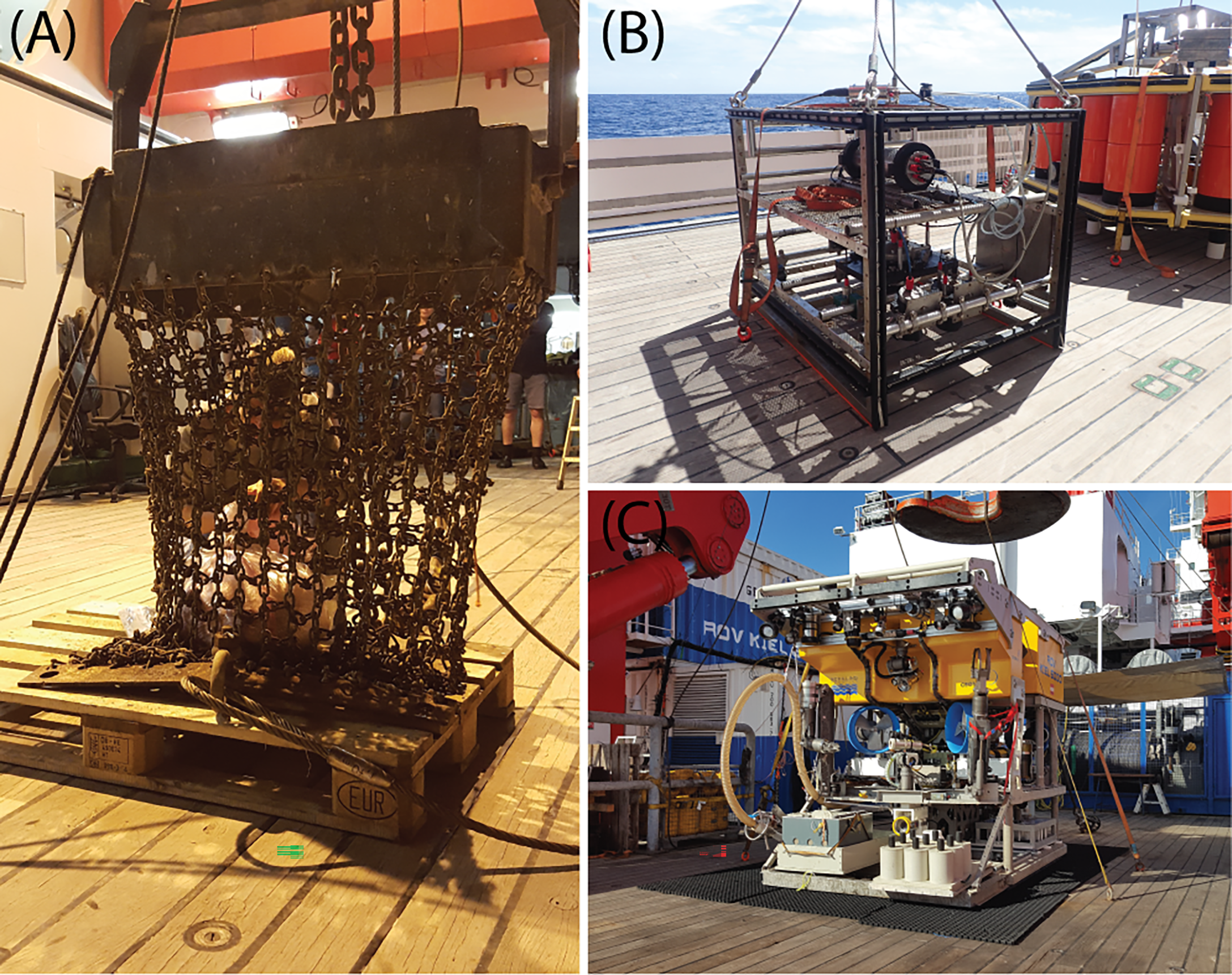 (A) The 1-m-wide geological chain dredge that was used to create a sediment plume in our study (photo courtesy: Henko de Stigter). (B) The Ocean Floor Observatory System (OFOS) of the RV Sonne (Photo courtesy: Yasemin Bodur). (C) Remotely Operated Vehicle (ROV) GEOMAR KIEL 6000 (Photo courtesy: Henko de Stigter).