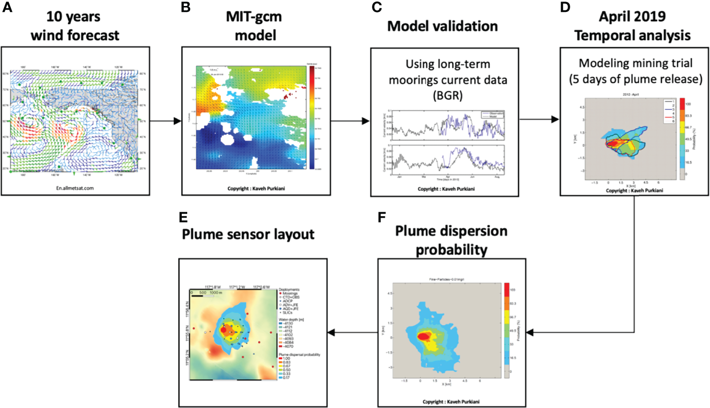 To date, several plume dispersion studies have been performed during seafloor impact experiments (e.g., Jones et al., 2017; Gausepohl et al., 2020 and references therein), some of these in areas which are licensed for mineral exploration. These studies focused on the resettling of sediment, as inferred from sediment trap data or from seafloor imagery (Barnett and Suzuki, 1997; Yamazaki et al., 1997; Peukert et al., 2018; Gausepohl et al., 2020), as well as on the monitoring of the suspended sediment plumes (e.g., Lavelle et al., 1982; Brockett and Richards, 1994). Based on observations of sediment plume dispersion and plume settlement, model predictions have previously been made (e.g., Nakata et al., 1997; Jankowski ; Rolinski et al., 2001; Zielke, 2001). However, comprehensive monitoring of the dispersion of the generated plumes was often limited by the available deep-sea technology at those times (e.g., point sensors rather than profilers; reduced navigational precision of ships and equipment; no AUVs and ROVs). Furthermore, comprehensive plume monitoring requires a spatially large and diverse sensor array around the mining/test site (Spearman et al., 2020; Baeye et al., 2022). Recent plume dispersion studies highlighted the importance of particle aggregation processes within the plume, which speeds up sediment settling and hence restricts the spatial dispersion of the plumes (Gillard et al., 2019). However, plume aggregation processes have not been considered in most of the previous modelling studies.