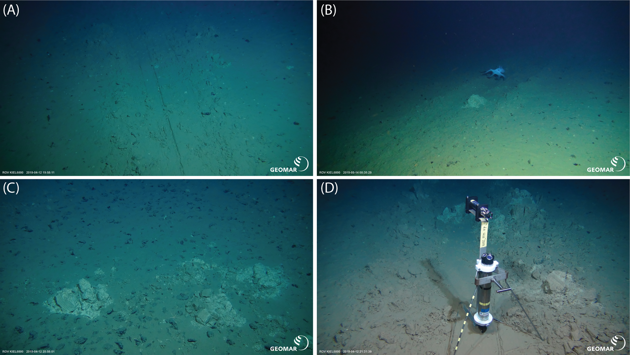The bottom currents are characterised by a semi-diurnal M2 tidal cycle, as well as a diurnal S1 tidal cycle (Aleynik et al., 2017). Generally, the bottom current speeds are low, with average speeds of approximately 3.5 cm s-1 and peak values usually below 10 cm s-1. However, during the passage of mesoscale eddies, which have their clearest expression at the ocean surface but of which the effect occasionally extends to the seafloor at >4 km depth, average current speeds increase to ~8 cm s-1, with peak values of up to 24 cm s-1 (Aleynik et al., 2017). Whilst background bottom currents are probably not strong enough to resuspend surface sediment most of the time, resuspension might well occur under peak bottom currents associated with these mesoscale eddies (Purkiani et al., 2020). Direct observations of sediment resuspension by eddies do not exist from the area. However, the occurrence of intermittent resuspension events was inferred from the observation that nodules covered by sediment settled from a plume around an epibenthic sledge (EBS) track in 2015 (Peukert et al., 2018) were free of sediment cover when the EBS track was revisited in 2019 during the SO268 cruise (Haeckel and Linke, 2021). With several mesoscale eddies passing annually over the area (Purkiani et al., in review), it is not unlikely that at least one eddy between 2015 and 2019 has been strong enough to remove and redistribute the sediment settled on the seafloor in 2015.