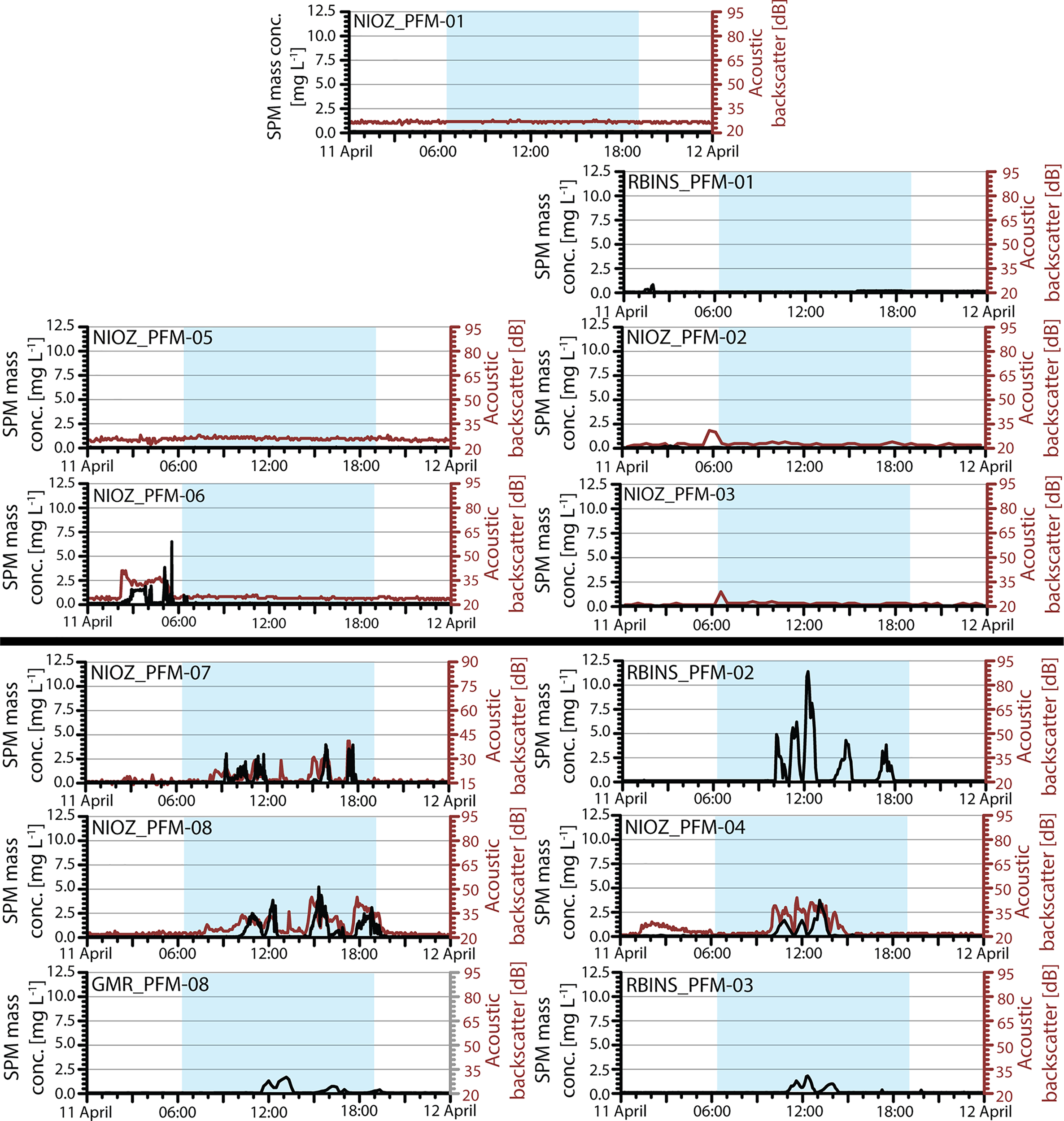 | RBINS_PFM-01 | 4 | CTD SBE19+ + 2 Seapoint OBS | 1 mab | 5 min interval, 40 cycles; 1 mab | 300 m north | ||||||