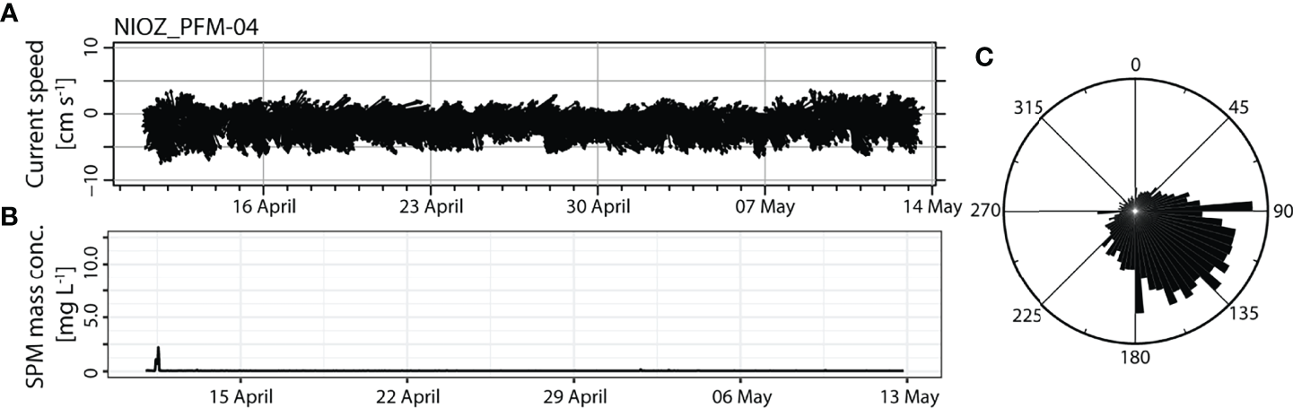1) Tripods equipped with an upward-looking Nortek Aquadopp 2 MHz current profiler recording current speed, current direction, and acoustic backscatter, and a JFE Advantech optical backscatter sensor (OBS) recording turbidity. NIOZ deployed seven of these platforms, named NIOZ_PFM-02 to -08.