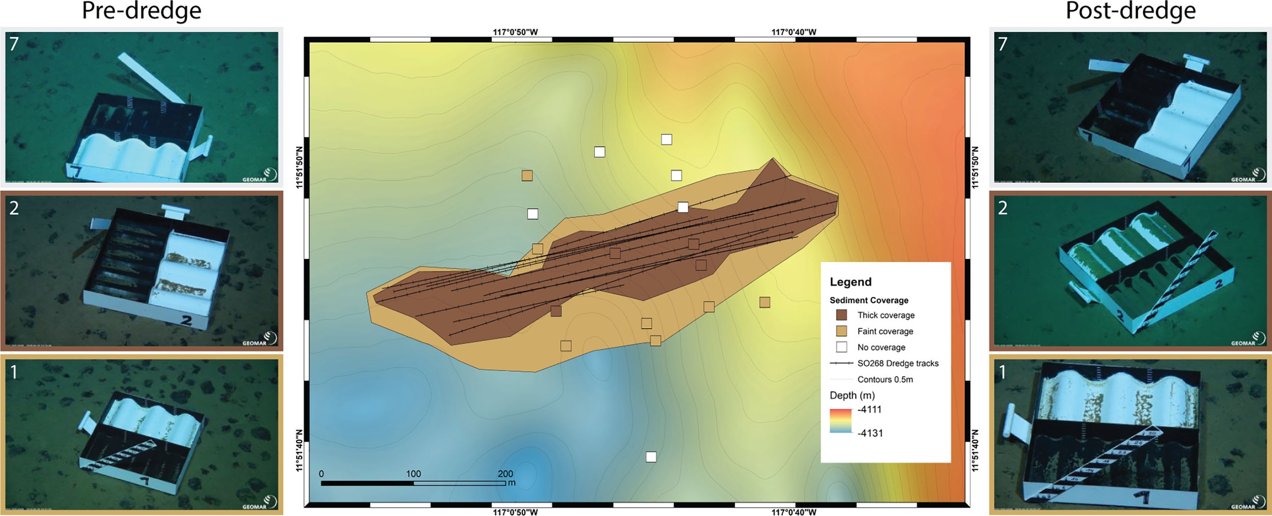 The trajectory of the dredge on the bottom was measured during dredging using a USBL beacon mounted to the wire 500 m ahead of the dredge. Post-dredging visual inspection using USBL-navigated OFOS and ROV video footage improved the accuracy of the observed dredge track locations.