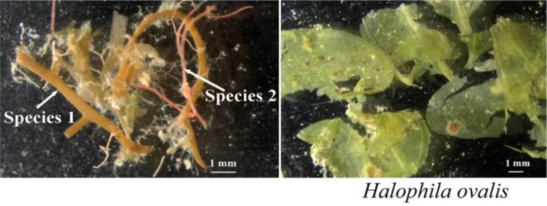 Intestinal contents of each fish species were collected for dietary assessment. Intestinal contents of individual fish were spread on glass culture dish and put under a microscope (Zeiss SteREO Discovery.V20, Germany). Photographs of the food items were taken using the microscope. Macrophytes species (Macroalgae and seagrasses) were only observed here, however, quantity analysis of the macrophytes composition wasn’t concerned. Macrophytes species were identified according to their morphological traits (Titlyanov et al., 2017; Huang, 2018).
