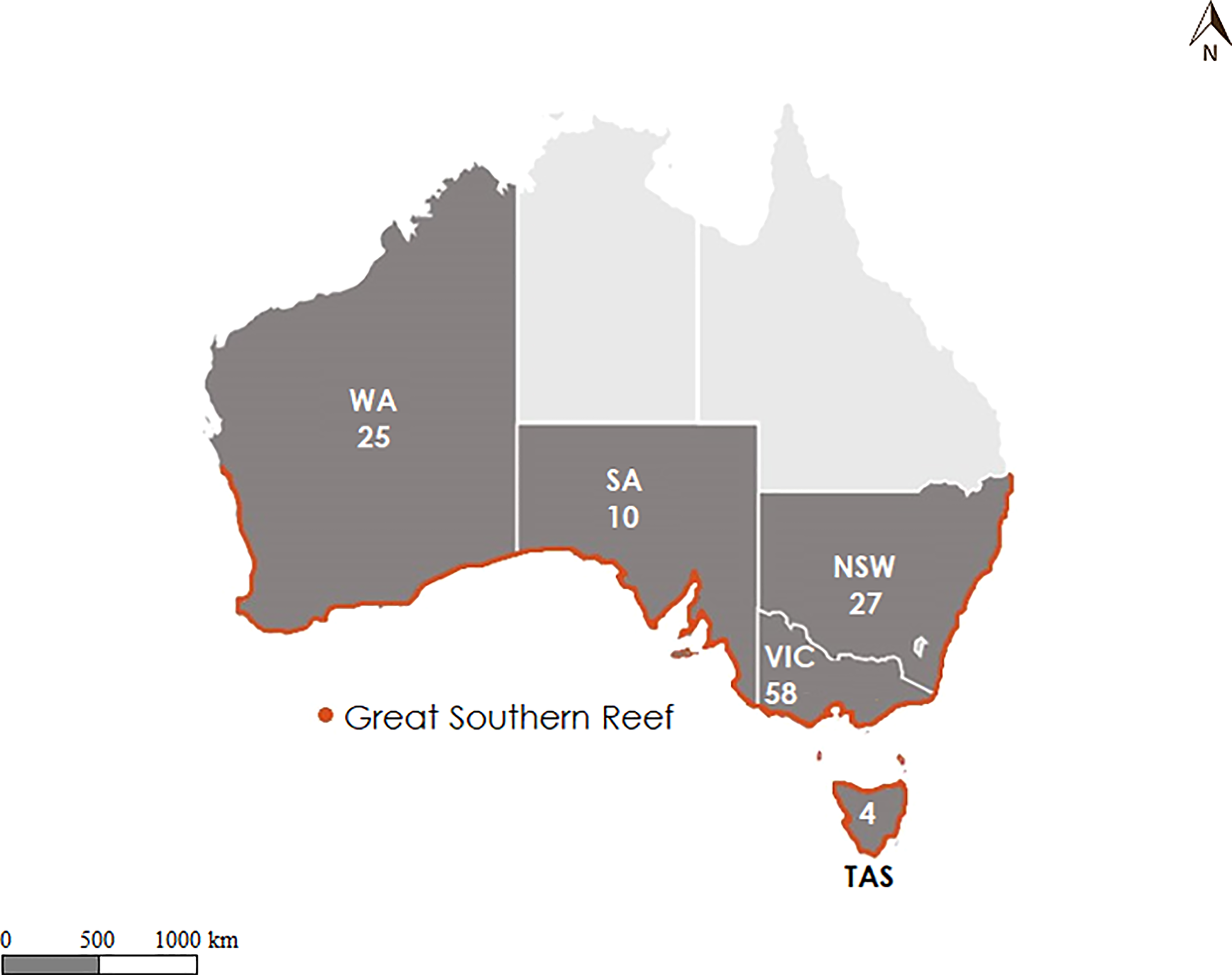 Number of returned surveys per each of the 5 states (WA, Western Australia; SA, South Australia; VIC, Victoria; TAS, Tasmania; NSW, New South Wales) bordering the Great Southern Reef (highlighted by the red line).