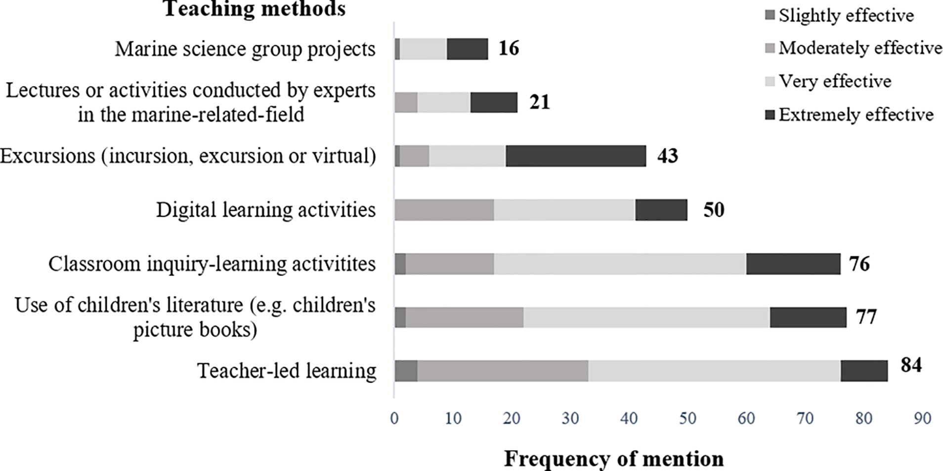 When asked about the methods used to teach marine science topics in class, almost all the participants (87.4%) selected at least two different methods, for a total of 367 cases (Figure 3). The most commonly used approaches included teacher-led learning, use of children’s literature and classroom inquiry-learning activities, and these three approaches were also considered very effective most commonly by teachers (Figure 3). The teaching method that was considered to be extremely effective by most respondents was the use of excursions, but only 43 (34.7%) of teachers employed this method. The category least employed by teachers was marine science group projects, but proportionally, was considered most effective by its users (more than 90% of teachers using this method considered it is very or extremely effective in raising children’s engagement in marine science topics; Figure 3).