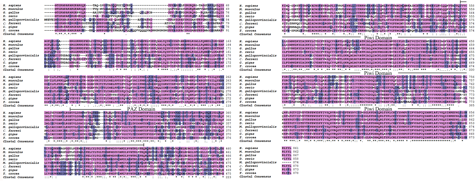 Multiple sequence alignment of Piwi1 proteins. The PAZ and Piwi domain are marked with a continuous line. The identical and similar sequences are highlighted in purple and gray, respectively. The accession numbers for the analyzed sequences are as follows: H. sapiens (NP 004755.2), M. musculus (NP067286.1), G. gallus (NP001092322.1), D. rerio (AAL57170.1), M. galloprovincialis (AMN88361.1), C. farreri (ALK82294.1), and C. gigas (XP 034338428.1) ‘*’ indicates positions which have a single, fully conserved residue; ‘:’ represent a similar amino acid residue position.