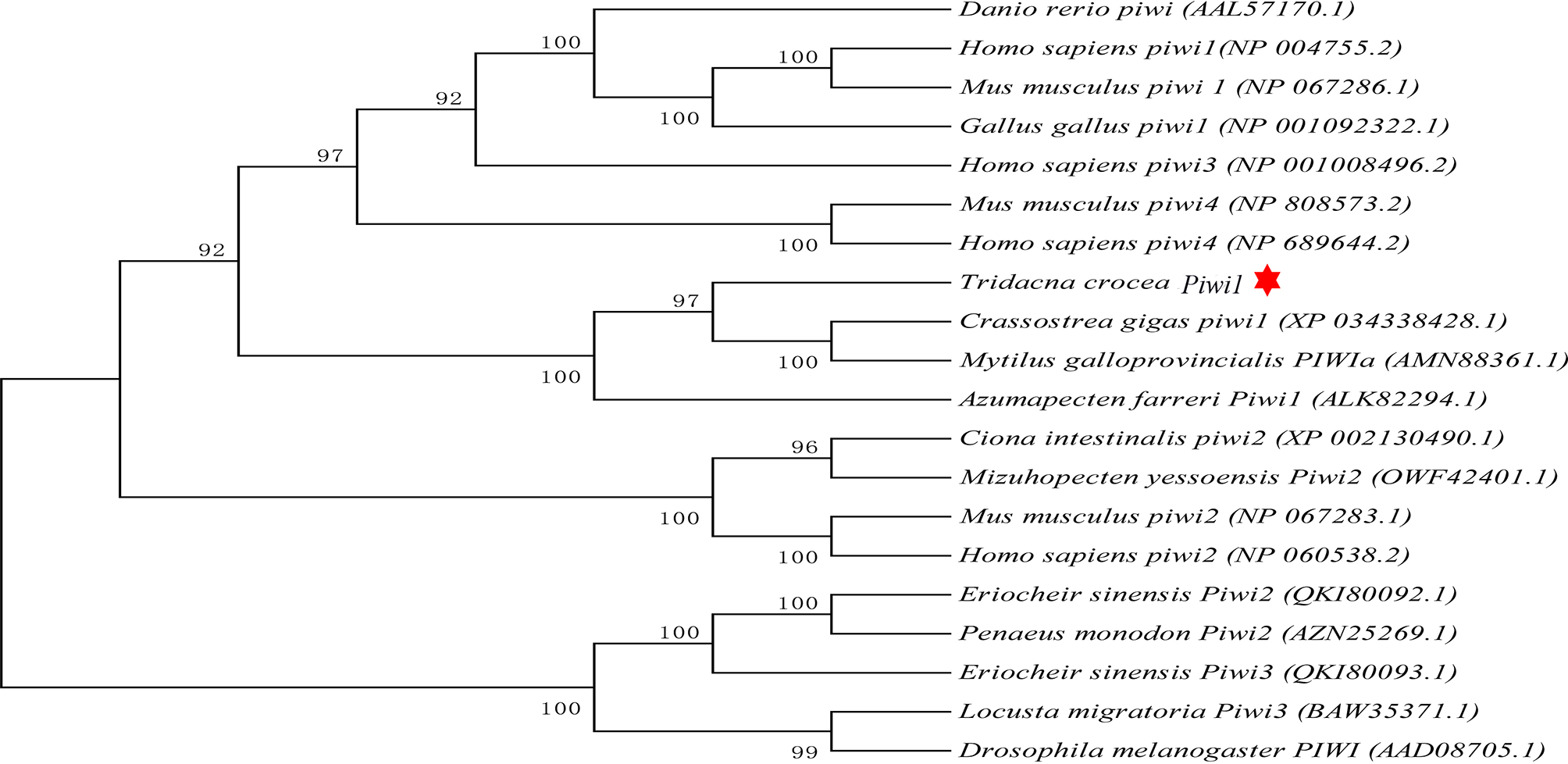 Understanding the gonadal development of giant clams is conducive to the better development of the artificial breeding of Tridacna. PGCs generation and gametogenesis are two key components of animal reproduction. Previous studies have reported that the Piwi gene plays an important role in the reproduction system (Houwing et al., 2007; Thomson and Lin, 2009). At present, a Piwi1 gene of T. crocea was cloned; Tc-Piwi1 protein contains conserved PAZ and Piwi domains, which has a high sequence identity with the Piwi homolog of vertebrates, which might imply that Tc-Piwi1 protein also has the same conserved role in invertebrate giant clams.