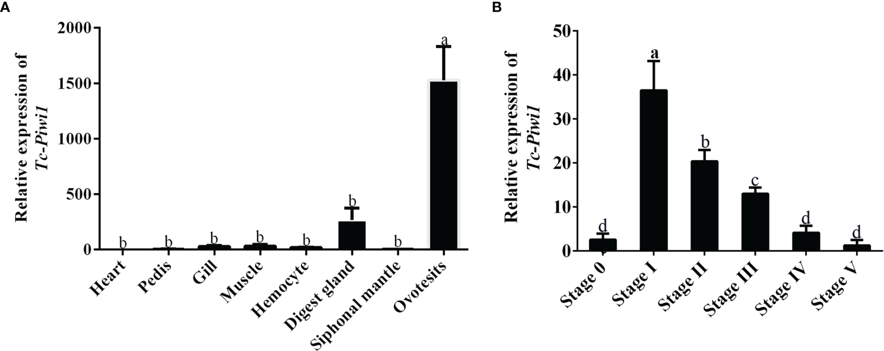Expression profiles of Tc-Piwi1 in (A) different tissues and (B) adult six gonad developmental stages by qRT-PCR. Stage 0 to stage V represent the undifferentiated stage, the male-dominated bisexual-phase gonad, the oocyte growing stage in ovotestis, the oocyte mature stage I in ovotestis, the oocyte mature stage II in ovotestis, and the oocyte regression stage in the ovary, respectively. β-Actin was used as a reference gene. Data are represented as the mean ± SD (N = 3), bars not sharing with the same letter are significantly differed at p < 0.05.