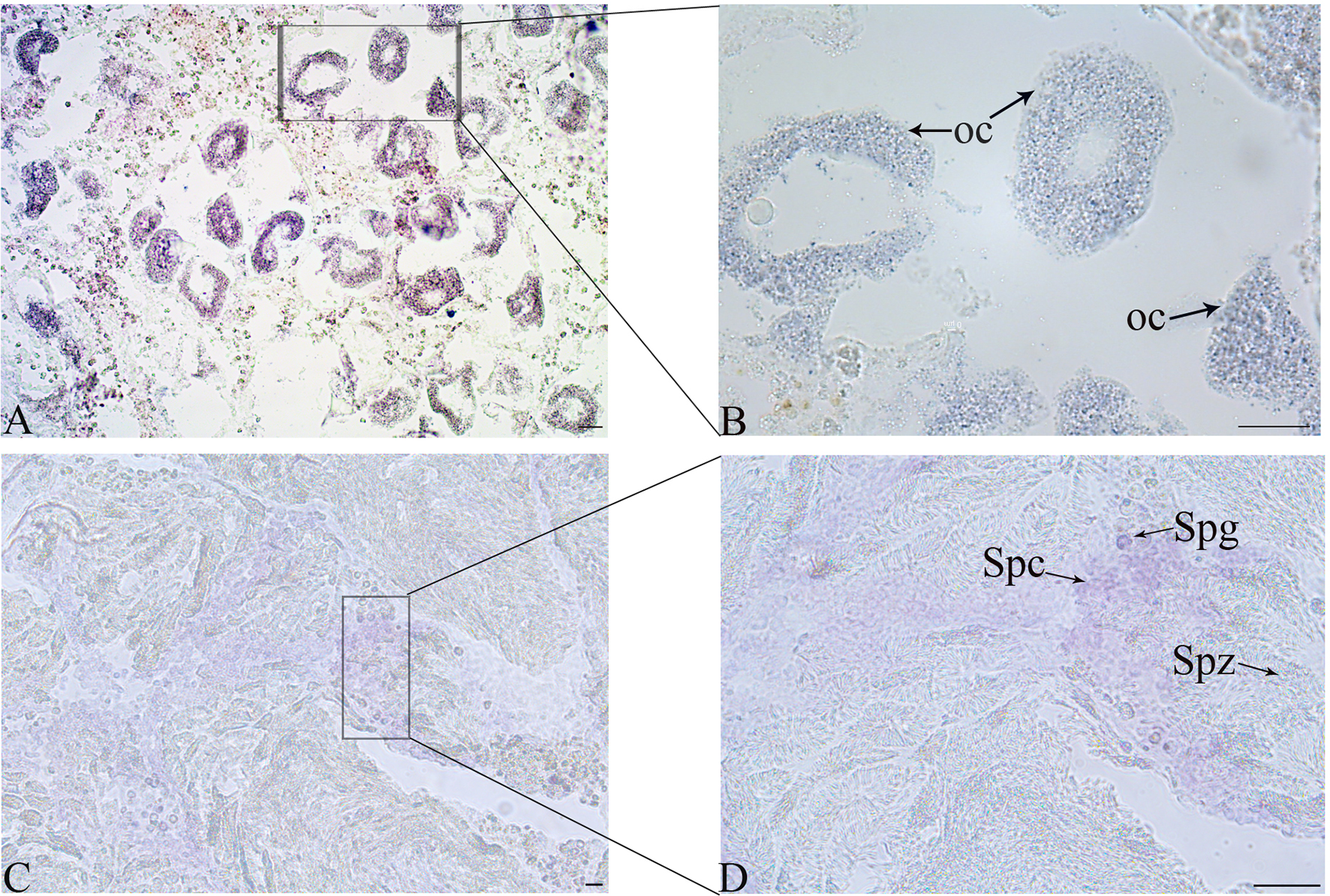 Cellular location of Tc-Piwi1 in female and male gonad tissues demonstrated by in situ hybridization (ISH). (A, B) The results of ISH with Tc-Piwi1 mRNA antisense probe in the ovary (Scale bar = 40 µm). (C, D) represent the results of ISH in testis by Tc-Piwi1 mRNA antisense probe (Scale bar = 25 μm). The positive signals were stained with dark-blue or purple. The cells in histological sections include spermatozoa (Spz), spermatocyte (Spc), spermatogonia (Spg), and oocyte (Oc).