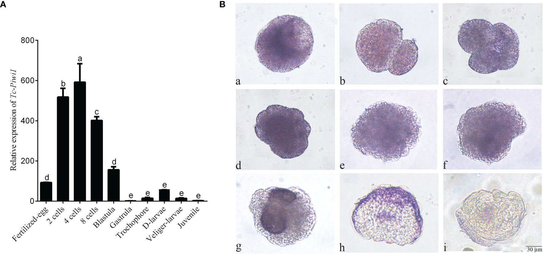 Expression of Tc-Piwi1 gene in fertilized oocytes and various embryonic stages of T. crocea. (A) Quantitative real-time PCR results for Tc-Piwi1, and RPL5 was used as a reference gene. Data are represented as the mean ± SD (N = 3), bars not sharing with the same letter are significantly differed at p < 0.05. (B) Location of Tc-Piwi1 in the fertilized egg and various developmental stages of embryos by WISH. (a) Fertilized eggs; (b) 2 cells; (c) 4 cells; (d) 8 cells; (e) Blastula; (f) Gastrula; (g) trochophore larvae; (h) D-shaped larvae; (i) Veliger larvae. Scale bar = 30 µm.