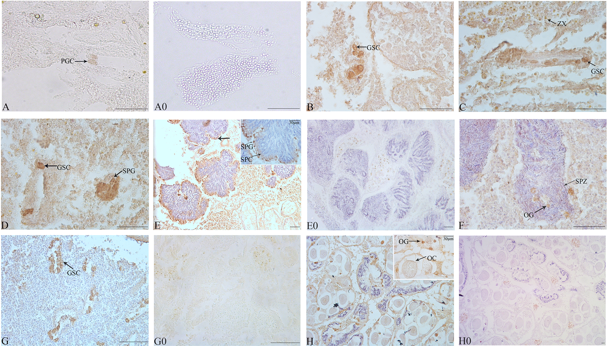 Observation of the gonad at the early development of juvenile T. crocea by immunohistochemistry. (A–H) The immunohistochemistry of gonads of T. crocea at 5, 6, 8, 10, 12, 17, 21, and 25 months, respectively. Germ cells specifically stained by anti-Tc-Piwi1 antibody are in dark brown. The sections incubated without the primary antibodies did not show any immunostainings (A0, E0, G0, and H0). The cells in histological sections include primordial germ cells (PGC), germ stem cells (GSC), spermatozoa (SPZ), spermatocyte (SPC), spermatogonia (SPG), oocyte (OC), oogonia (OG), and symbiotic dinoflagellates (zooxanthellae (ZX)). Scale bar = 20 µm.