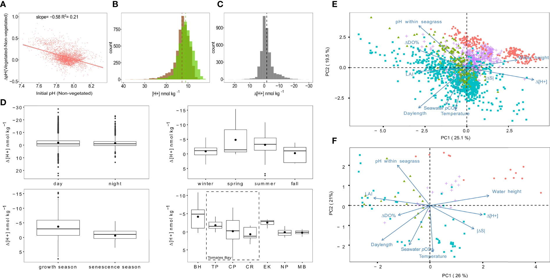 Corrections and clarifications to figures and assertions of VD. (A) Corrected version of VD’s panel A, showing ΔpH as a function of outside-meadow pH. Since ΔpH reflects a relative change in hydrogen ion concentration ([H+]) with respect to baseline conditions outside a seagrass meadow, it is more appropriate to use outside-meadow pH as the independent variable, rather than inside-meadow pH as was done in VD. The correction shown here results in a reversal of the slope of VD’s teal point cluster. The red point cluster in VD’s panel A depicts the same data as the teal points, except with outside-meadow pH on the x-axis. However, the red cluster is incorrect because it plots an inversion of ΔpH (i.e., -ΔpH) as the dependent variable rather than ΔpH; this mistake artificially inflates the number of negative ΔpH data at low pH in VD’s graph. Thus, the red points are simultaneously unnecessary and misleading. (B, C) Replotted versions of Figures 1A, 1B from Ricart et al. (2021), using [H+] instead of pH. Patterns here show matching trends to the figures of the original article, despite the change from logarithmic to arithmetic scaling along the x-axis. Colors indicate data from seagrass ecosystems (green), adjacent non-vegetated areas (brown), and differences between seagrass ecosystems and non-vegetated areas (grey). Dashed lines denote mean values. (D) Replotted version of Figure 5 from Ricart et al. (2021), demonstrating that key results again remain invariant if Δ[H+] is used instead of ΔpH. Note that y-axis values here run from positive at the bottom to negative at the top (expected given pH=-log[H+]), with negative Δ[H+] corresponding to amelioration of low pH. Top left, Δ[H+] during daytime compared to nighttime; top right, comparison of Δ[H+] among seasons; bottom left, comparison of Δ[H+] between seagrass productivity periods; bottom right, comparison of Δ[H+] among sites ordered latitudinally from north at left to south at right, including three seagrass meadows within Tomales Bay (dashed box). See Ricart et al. (2021) for additional details. (E, F) Principal components analyses (PCA) analogous to that of Figure 6 in Ricart et al. (2021) using Δ[H+] instead of ΔpH and incorporating ΔDO% and |ΔS| measurements. Results are shown for both the 1-h and 24-h datasets, respectively. Note that in both plots, Δ[H+] is negatively correlated with ΔDO% and positively correlated with |ΔS|, indicating that amelioration events [negative Δ(H+) values] tend to comport mainly with photosynthesis as a driver, and not with conditions characterized by strong water property gradients. RMS velocity does not appear in these plots, due to greater numbers of gaps in the velocity and ΔDO% records, which reduces their temporal overlap and prevents their simultaneous inclusion.
