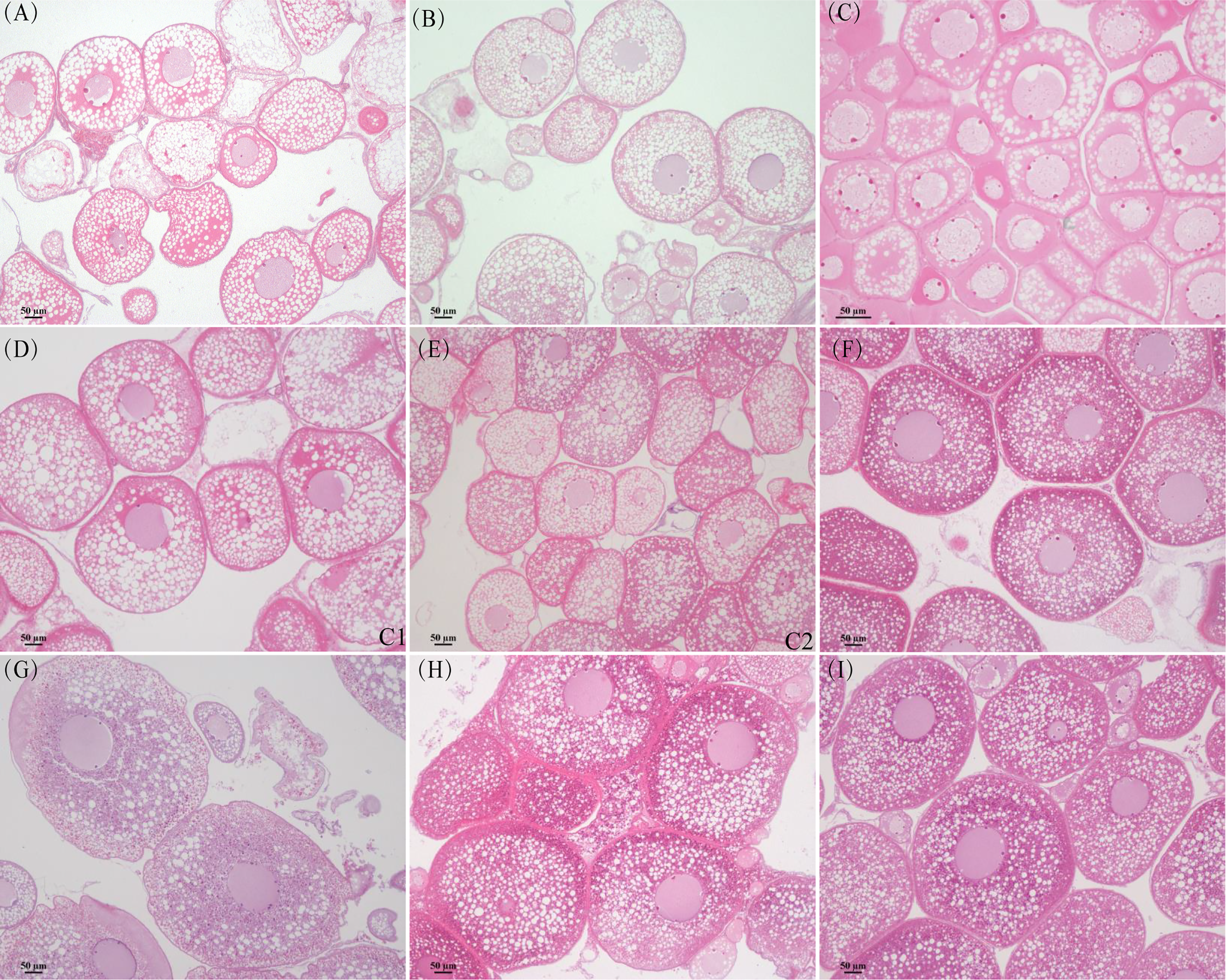 The ovaries of the control group, group A1, and group A2 did not develop. However, the ovaries of groups B1 and B2 were further developed. Eels of the control group (Figure 2A), group A1 (Figures 2B, C), and group A2 (Figures 2D, E) contained oocytes representing the oil droplet stage and primary yolk globule stage according to Tomoko et al. (Tomoko et al., 2003). The ovaries of eels in groups B1 (Figure 2F) and B2 (Figure 2H) were at the secondary pharmaceutical globule stage and tertiary pharmaceutical globule stage on the 30th day. The ovaries of eels in groups B1 (Figure 2G) and B2 (Figure 2I) are in the tertiary globule stage and migratory nucleus stage on the 60th day.