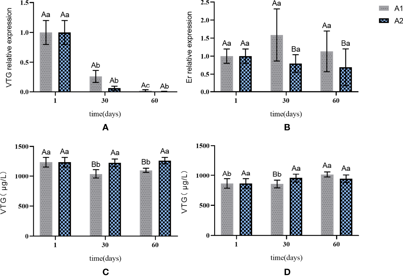 The expression of VTG and Er genes in liver and the content of VTG in liver and serum in A1 and A2. (A) VTG gene expression in the liver. (B) Er gene expression in the liver. (C) changes in the content of VTG in the liver. (D) changes in the content of VTG in the serum. The capital letters marked in the chart indicate significant differences between the swimming group and the resting group (p < 0.05). Lowercase letters indicate differences within the same group (p < 0.05). VTG, vitellogenin; Er, estrogen receptor.