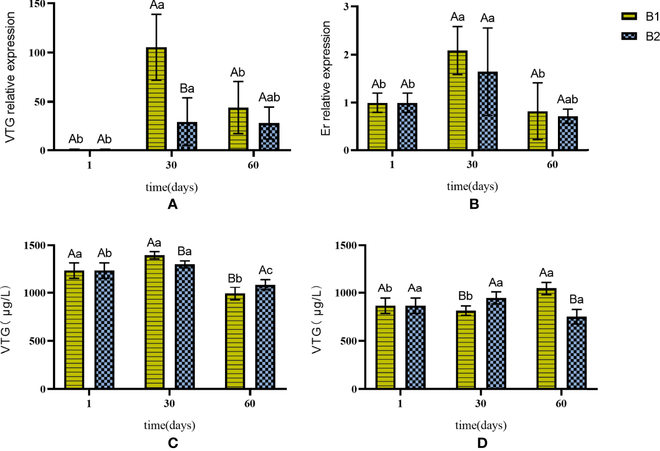 The expression of VTG and Er genes in liver and the content of VTG in liver and serum in B1 and B2. (A) VTG gene expression in the liver. (B) Er gene expression in the liver. (C) changes in the content of VTG in the liver. (D) changes in the content of VTG in the serum. The capital letters marked in the chart indicate significant differences between the swimming group and the resting group (p < 0.05). Lowercase letters indicate differences within the same group (p < 0.05). VTG, vitellogenin; Er, estrogen receptor.