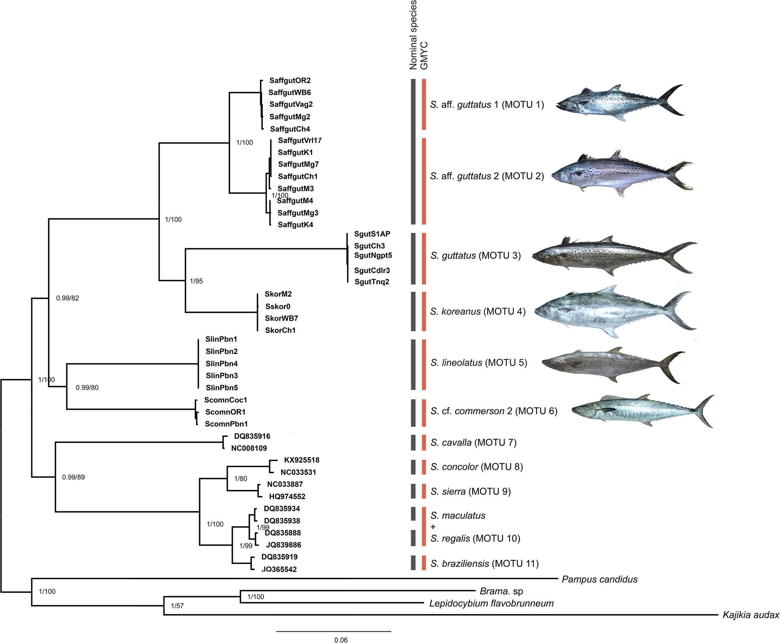 Biodiversity loss is one of the most serious issues with direct consequences, and species form the meter of biodiversity and conservation (Halasan et al., 2021). Spanish mackerels are harvested and exploited indiscriminately, compounded by their biological attributes (Zacharia et al., 2016; Hashemi and Doustdar, 2022). It is recommended that genetics needs to be well-integrated into the global biodiversity index while assessing conservation and risk priorities (Garner et al., 2020). Scomberomorus accounts for nearly 35% of reported Scombrids, but data-rich status regarding their genetic and life history research is limited to a few such as S. cavalla, S. commerson, and Scomberomorus maculatus (Juan-Jordá et al., 2013). The IUCN Red List (IUCN 2022. Version 2021-3, https://www.iucnredlist.org) assigns “near threatened” status to S. commerson and Scomberomorus munroi, “vulnerable” to S. concolor, and “data deficient” to S. guttatus, Scomberomorus niphonius, Scomberomorus plurilineatus, and Scomberomorus sinensis, while the remaining 11 species are of least concern. Despite shaping a cardinal transoceanic fishery, the molecular taxonomy of this group remained confined to the sole phylogenetic assessment study by Banford et al. (1999), who evaluated the effect of the Eastern Pacific/Eastern Atlantic biogeographic track (Rosen, 1975) on the diversification of new world taxa of the species group S. regalis. It may be added that certain species of Spanish mackerels are not yet represented in the GenBank (e.g., Scomberomorus lineolatus, Scomberomorus koreanus, and Scomberomorus multiradiatus). The void in the accurate identification and systematics of the Spanish mackerels necessitates detailed investigations from the respective oceanic provinces, including the Indian Ocean, which is an integral part of the speciose Central Indo-Pacific (Miller et al., 2018), for more comprehensive data coverage.