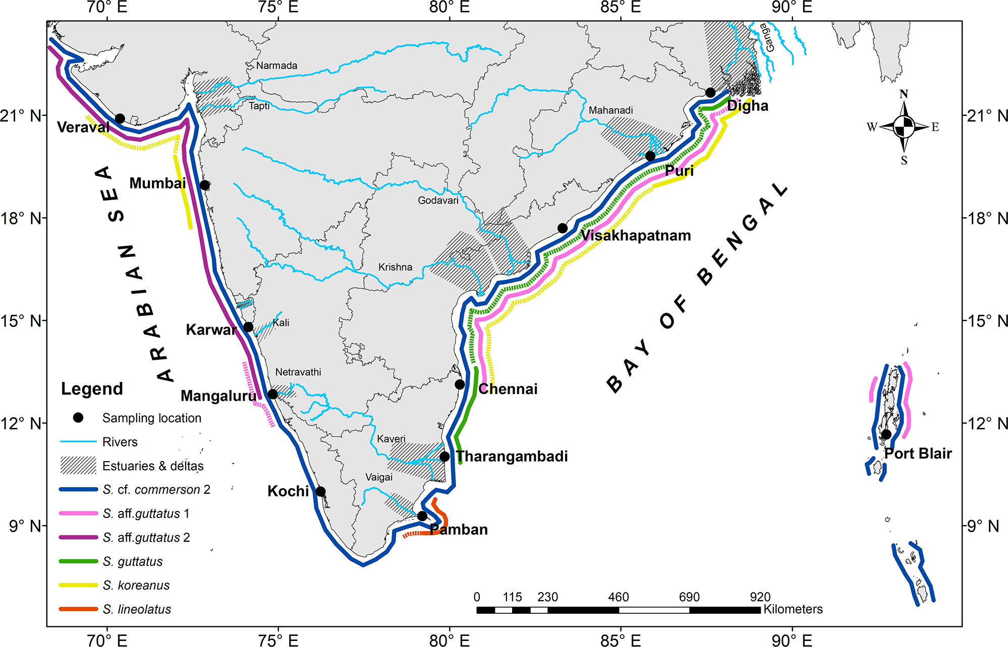 The Northern Indian Ocean, an element of the Indian Ocean covering 29% of the global ocean area (Wafar et al., 2011), is bifurcated by landmasses to the north into two intracontinental seas, viz., the Arabian Sea to the west and the Bay of Bengal to the east (Monolisha et al., 2018). In the review of “Scombrids of the world”, Collette and Nauen (1983) listed four species in Scomberomorus from India, viz., S. commerson (Lacepède, 1800), S. guttatus (Bloch and Schneider, 1801), S. lineolatus (Cuvier, 1829), and S. koreanus (Kishinouye, 1915). Silas (1964), who redescribed S. guttatus, proposed a wide distribution of the species in the Indo-Pacific while simultaneously predicting the likelihood of geographic races therein based on variations in vertebral counts cited in the earlier literature. Later, Devaraj (1976) who discovered S. koreanus in the Palk Bay (Indian Ocean) supported this observation and added some significant morphological measurements to distinguish the races. Differences in morphometry have been reported in S. guttatus distributed along the Indian coastline (Rao, 1975). Collette and Russo (1984) found no significant differences in morphometric data between populations of S. guttatus in the Arabian Sea and the Bay of Bengal, while it was evident in the races from the Pacific. They also observed a difference in the number of vertebrae between these two population clusters. Rao and Lakshmi (1993) suggested that S. lineolatus, distributed in the south-east coast of India, is a natural interspecific hybrid and not a valid species, which was refuted by Collette (1994) with a recommendation to include molecular methods to define and characterize the species in Scomberomorus. In the Indian context, taxonomic assessment supported by vanguard molecular tools remained a veritable blank, except for the classic works of the predecessors mentioned above.