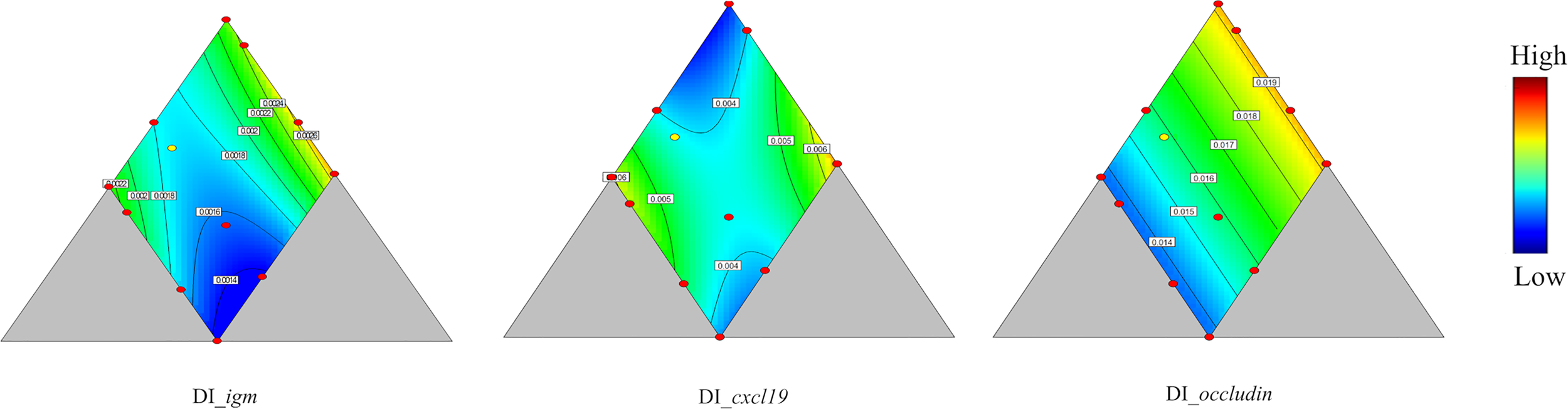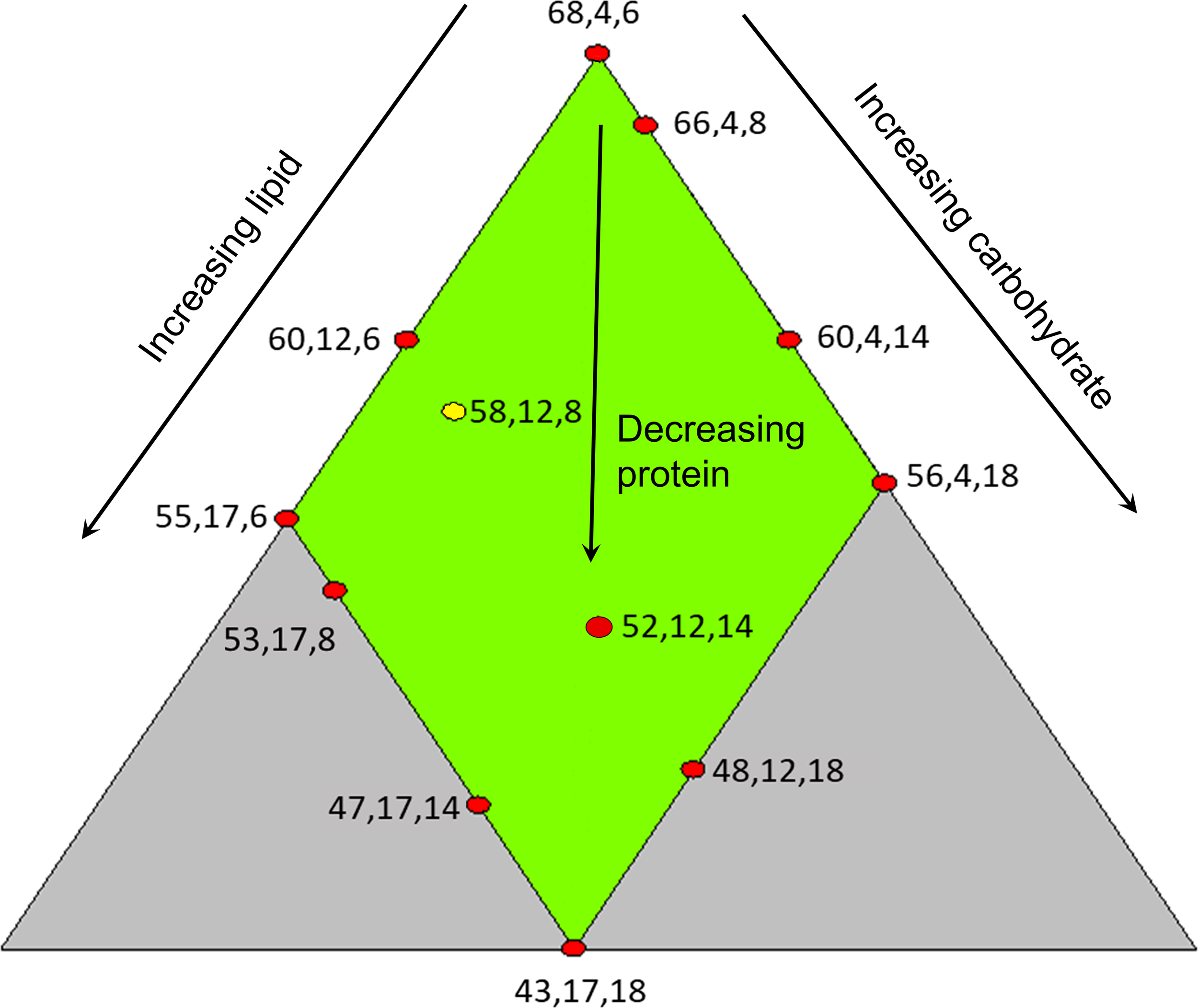 Illustration of feed design. Each feed is indicated with a red dot and numbers beside the dot presenting macronutrient composition in the following sequence, from left to right, level of crude protein, crude lipid and total carbohydrates. The yellow dot represents diet was fed to fish in three tanks.