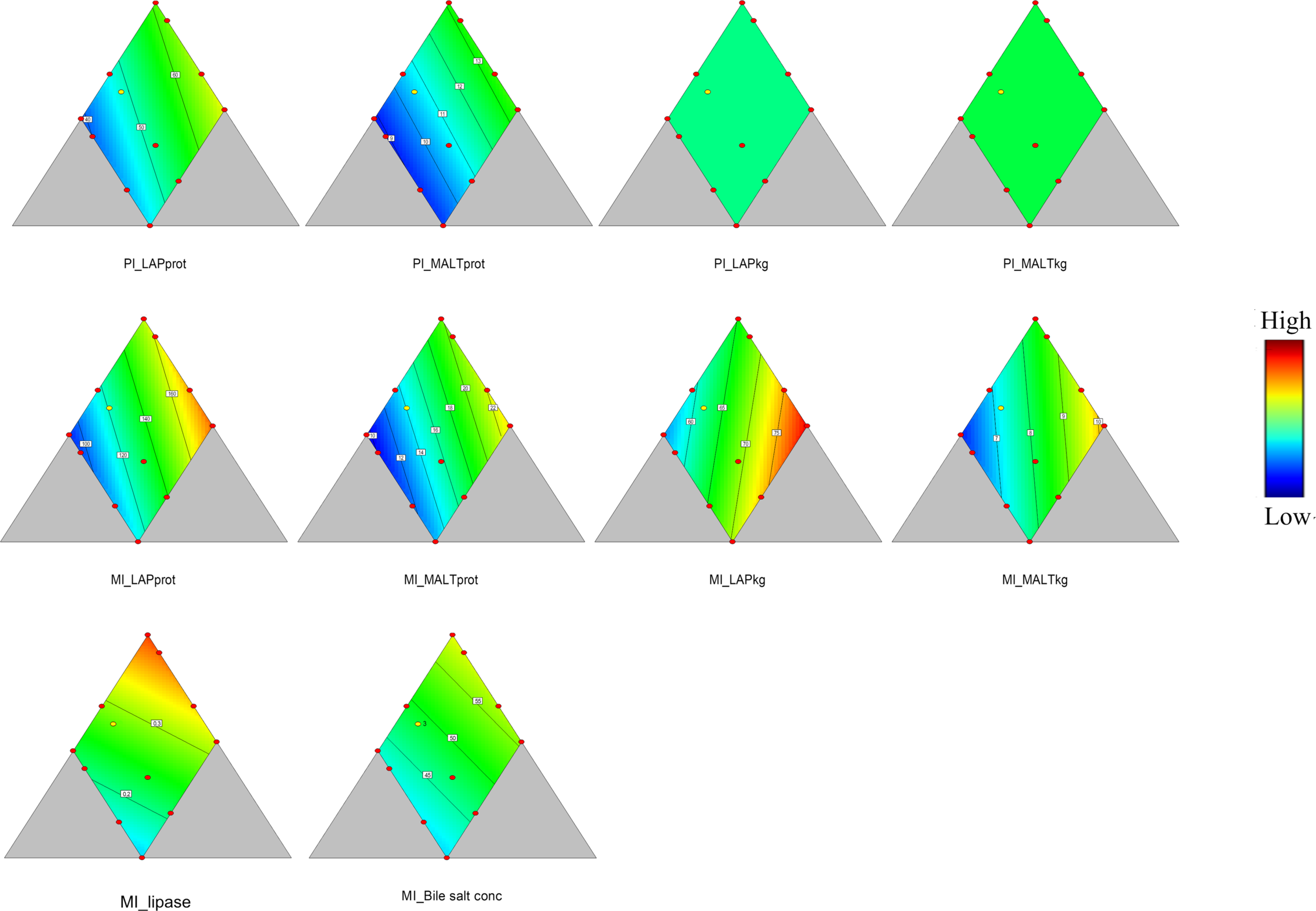 Activity of trypsin, amylase and lipase, and total bile salt level were measured in pooled freeze-dried content from MI. Trypsin activity was determined colorimetrically (Kakade et al., 1973). Benzoylarginine p-nitroanilide (Sigma no. B-4875, Sigma Chemical Co., St. Louis, MO) is used as substrate and is reacted to freeze-dried content solution at 37 °C for 10 min. The reaction is terminated by 30% acetic acid. The color absorbance is read at 410nm. Absorbance variance between sample and blank is defined as enzyme unit instead of international enzyme unit. Lipase activity was determined as described in (Brockman, 1981). 4-Nitrophenyl myristate (Sigma 70124, Sigma Chemical Co., St. Louis, MO) is used as substrate and the reaction temperature is 37 °C. The absorbance is read at 405nm every 30 sec for 7 times. The enzyme unit is defined as absorbance variance per minute. Amylase was determined as described by (Froystad et al., 2006), using a Randox amylase assay kit (AY3805, Randox Laboratories Ltd., Crumlin, UK). The kit employs Ethylidene PNPG7 method (Kruse-Jarres et al., 1989) for α-amylase measurement. Ethylidene-blocked p-nitrophenyl-maltoheptaoside is the substrate in the enzyme assay reagent and reaction temperature is 25°C. Absorbance is read at 405nm after 20, 30 and 40 min of reaction and the enzyme unit is defined as absorbance variance per minute. Bile salt level was determined using the enzyme cycling amplification/Thio – NAD method (Inverness Medical, Cheshire, UK) in the ADVIA®1650 Chemistry System (Siemens Healthcare Diagnostics Inc.) at the Central Laboratory of the Faculty of Veterinary Medicine, Norwegian University of Life Sciences, Oslo. The assay measures total 3αOH of cholic acid, whereas the reported results indicate the corresponding level of bile salt as taurocholate.
