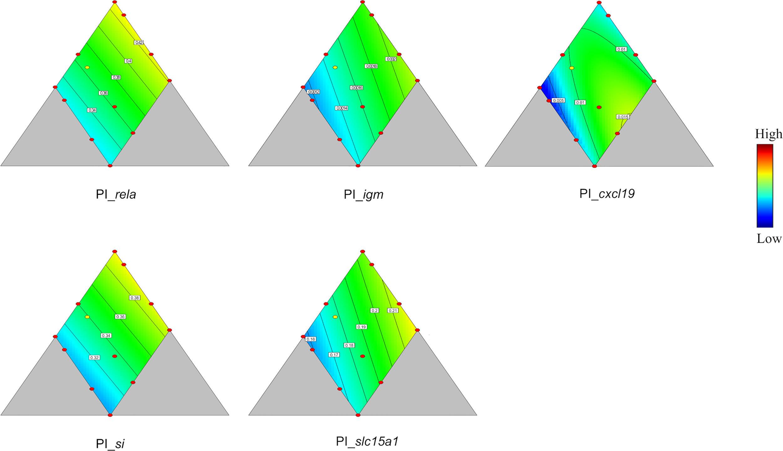 Total RNA was extracted from tissue samples of PI, MI, DI, and liver. (~20 mg) of all fish using Trizol reagent (PureLink™ RNA Mini Kit, Thermo Fisher Scientific). RNA was purified by an on-column DNase kit (PureLink™ DNase Set, Thermo Fisher Scientific) according to the manufacturer’s protocol. RNA purity and concentration were measured using the Epoch Microplate Spectrophotometer (BioTeK Instruments, Winooski, USA). The RNA integrity was verified by the 2100 Bioanalyzer (Agilent Technologies, Santa Clara, CA, USA) in combination with RNA Nano Chip (Agilent Technologies, Santa Clara, CA, USA). First-strand complementary DNA (cDNA) was synthesized using 1.0 μg RNA from two fish of the same tank, namely 0.5 μg RNA of each two fish were combined as a unit of RNA sample for cDNA synthesis. The reaction volume was 20 μl, including 4 μl mastermix of from the kit SuperScript™ IV VILO™ Master Mix (Thermo Fisher Scientific). Negative controls were performed in parallel by omitting RNA or enzyme.