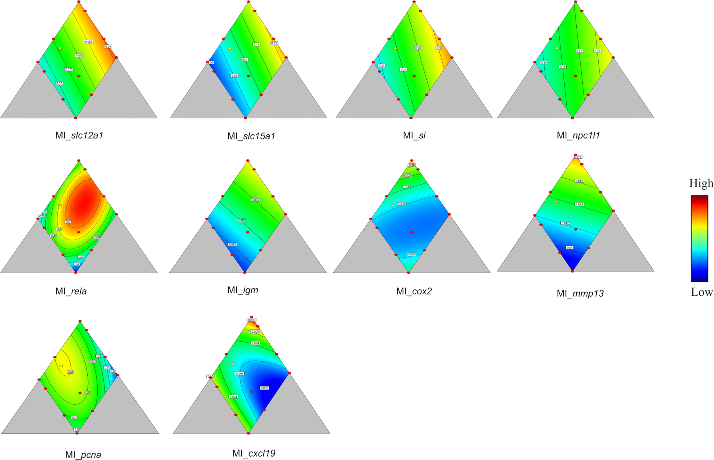 This experiment evaluated effects of diet composition on digestive functions in lumpfish with an initial body weight of 15 g growing to 50 g. The experiment was conducted based on a three-component mixture design (Cornell, 2011), set up with Design Expert ver. 8.0.4. (Stat-Ease Inc. MN, USA). As it is a special type of response surface methodology for experimental design, for which replicates are not necessary (Hamre et al., 2003; Hamre and Mangor-Jensen, 2006; Hamre et al., 2013), we set one tank for most diets. In total, twelve different diets were formulated and fed to fish in one tank for each one of 11 diets. The 12th diet was fed to fish in 3 tanks to obtain a measure of tank variation. The experimental diets were produced at the Aquafeed Technology Centre of Nofima in Bergen, Norway, in the same production series, using a Wenger TX-52 co-rotating twin-screw extruder with 150 kg/h capacity. The dietary oil was added in the different feed mixes prior to extrusion. The settings of the extruder were “normal”; i.e., the production can be upscaled to a feed factory (extruder settings considered: screw configuration (D), die opening (1.5 mm), knife speed (2671-3108 rpm), feed rate (110-150 kg/h), at the DDC the amount of added steam was 10-12 kg/h, and water 0.16-0.18 kg/min, and in the extruder there was added 0.24-0.45 kg/min water and no steam. The ingoing temperature of the feed mass in the extruder was 79-84°C and the outgoing 103-118°C. The produced pellets were air-dried in a carousel dryer (Model 200.2, Paul Klöckner GmbH, Nisteral, Germany) at 85°C for 10-12 min to a final moisture level between 6.36 and 8.26%. The size of the dried pellets was approx.: 1:5 − 1:7 × approx.: 2:3mm with bulk density between 443 and 582 g/L. Diet recipes and proximate composition are shown in Table 1 and Figure 1 illustrates the dietary design of experiment E1. The following ranges of macronutrients were covered: Protein 43-68%, lipid 4-17%, and carbohydrate 6-17%. For most observed biomarkers, samples from all treatments were investigated. For some, due to resource restrictions, it was possible to investigate only selected macronutrient combinations.