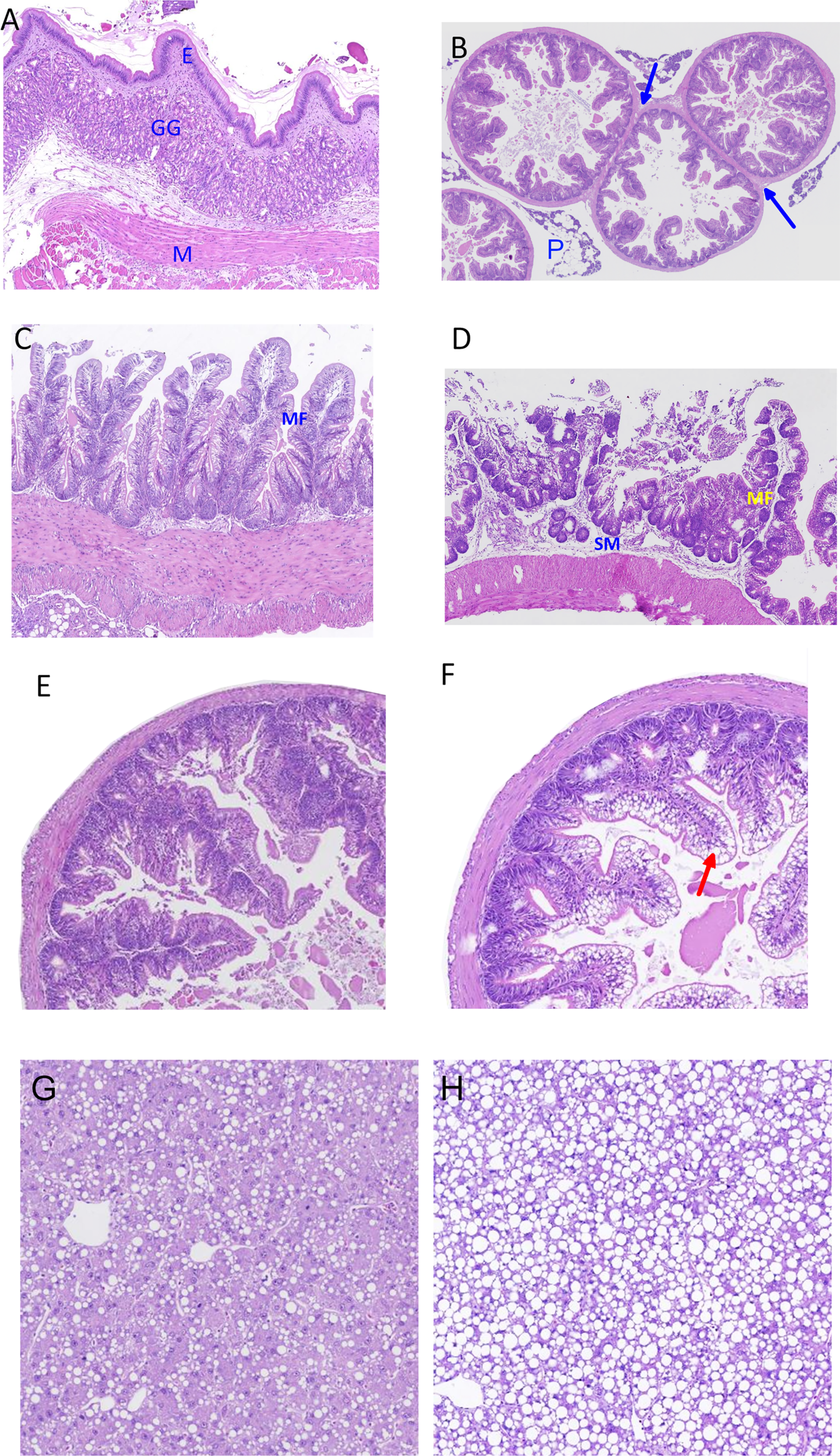 Present knowledge of digestive physiology in lumpfish is very limited. Zhukova and Stroganov (Zhukova and Stroganov, 2021) described the anatomical structure of the alimentary tract in lumpfish, with focus on esophagus and the stomach. The oesophagus is reported to be relatively short with a thick muscular wall whose thickness may increase more than two folds during contraction. The stomach was observed with well-developed gastric glands and distinguishably divided into cardiac, fundus, and pyloric parts. Intestinal length was estimated to be 1.2 times of the standard body length, and the histological structure found the same throughout its entire length. Some studies on lumpfish employed histopathological evaluation of intestine as an indicator of inflammatory responses after changes in diet composition or feeding strategy (Imsland et al., 2018; Imsland et al., 2019a; Imsland et al., 2019b). The observed responses, however, were mild or none.