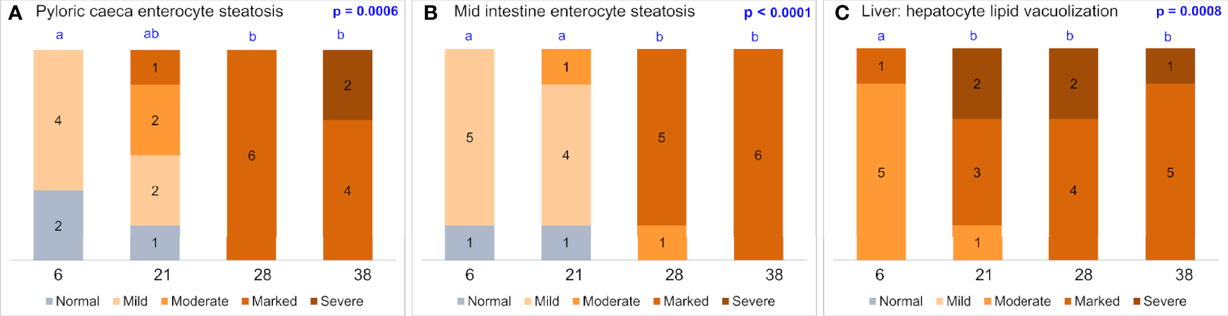 The trial was terminated after 42 days. At termination of the experiment, 6 fish from each tank were sampled at random, weighed, and intestinal tissues collected for analyses. The intestine was cleaned of mesenteric fat and divided into three segments, i.e., pyloric intestine including the pyloric caeca (PI), mid intestine (MI) and distal intestine (DI) (See Supplementary Figure S1). Each segment was opened longitudinally. Limited by fish size, gut content was only collected from MI, where the amount was enough for analysis. The collected gut content of MI was snap frozen in liquid nitrogen and stored at -80°C before further processing and analysis of activity of digestive enzymes and concentration of bile salts. Samples of tissue from all sections, located in the middle of the sections were collected for RNA extraction (submerged in RNAlater solution, incubated at 4°C for 24 h and stored at -20°C) and histomorphological evaluation (fixed in 4% phosphate-buffered formaldehyde solution for 24 h and transferred to 70% ethanol for storage). The remaining tissue was collected for brush border digestive enzyme assessment, snap frozen in liquid nitrogen and stored at -80°C.