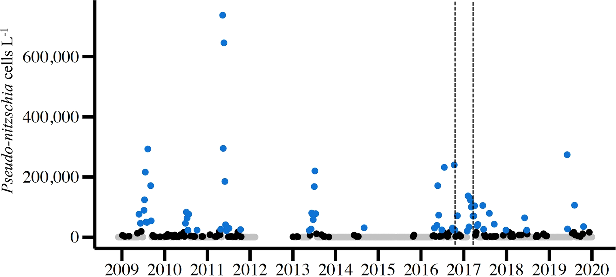Abundance of live Pseudo-nitzschia spp. cells from light microscopy counts of weekly NBPTS surface seawater samples spanning Dec 2008 – Dec 2019 (n=523). The NBPTS paused during Mar 2012 – Dec 2012, so no cell counts were collected. Blue points represent Pseudo-nitzschia abundance that surpassed the RI Department of Environmental Management (DEM) HAB abundance threshold of 20,000 cells per liter, while black points are non-zero abundances below the threshold and gray points are zero counts. Dotted lines denote the 2016 precautionary shellfish closure (Oct 7–30) and 2017 closure (Mar 1–24).