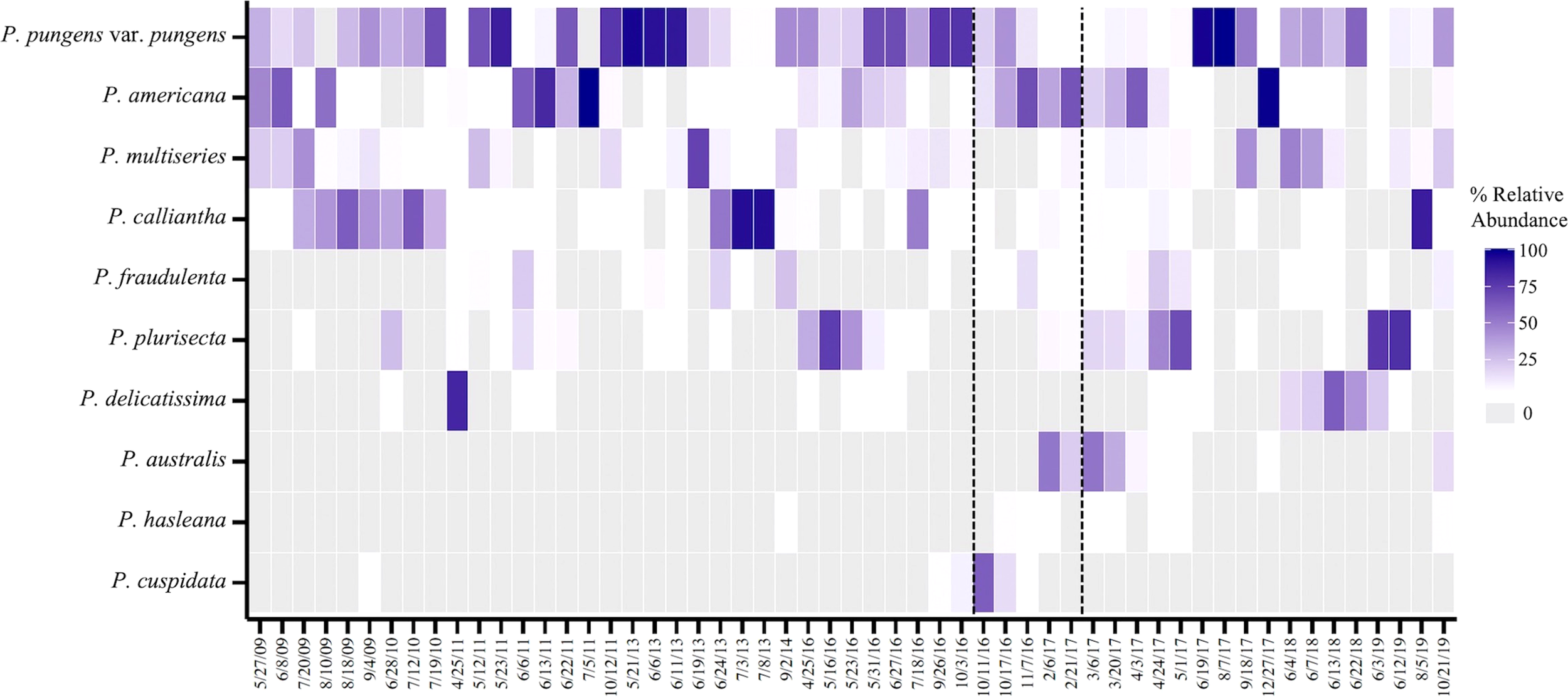 During the study period, December 2008 – November 2019, Pseudo-nitzschia species were observed by light microscopy each year, excluding the gap in 2012 (Figure 2). Cell counts at the genus level surpassed the RI DEM HAB abundance threshold of 20,000 cells per liter each year for which there was abundance data except 2015 (Figure 2) (RI DEM, 2021). Specifically, weekly samples surpassed the cell abundance threshold 69 times across all seasons, though more frequently during spring (n=20) and summer (n=33) months (Figure 2). The closure years in 2016 and 2017 alone comprised 38% of these high cell abundance samples: 2016 (n=11) and 2017 (n=17). A subset of our total sequenced samples (n=55) have corresponding cells counts that surpassed the RI DEM HAB threshold and were used to analyze Pseudo-nitzschia species composition during high abundance periods. P. pungens var. pungens occurred most frequently on dates of high cell counts, followed by P. multiseries and P. americana (Figure 3). Only one sample contained just one species (P. pungens var. pungens; Aug 07, 2017), while all other samples contained between 2 and 7 species (Figure 3).