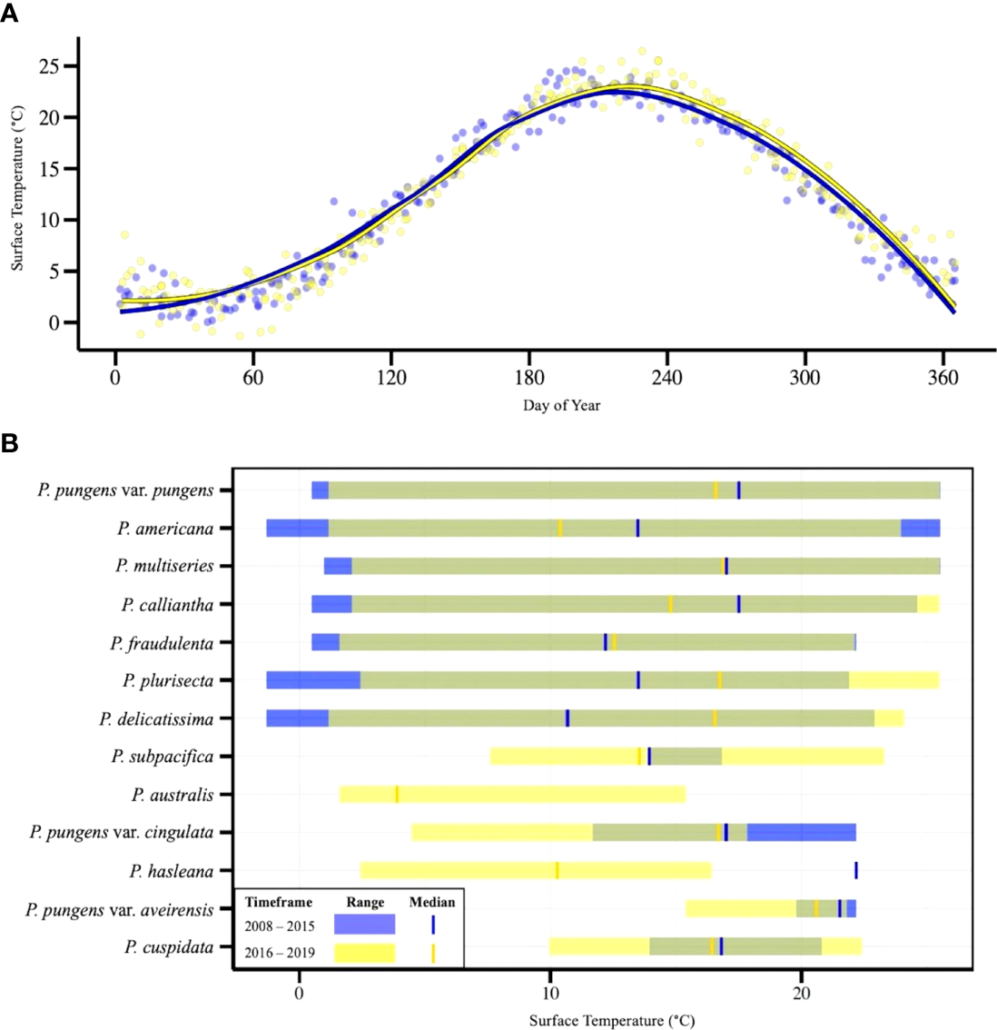 (A) Sea surface temperature at the NBPTS site over an annual cycle with two loess smoother lines representing the timeframes before (2008-2015; blue) and during/after closures (2016-2019; yellow). (B) Thermal ranges of Pseudo-nitzschia species that were found in >5% of samples. Ranges are based on sea surface temperature of presence/absence occurrence during two timeframes. Samples from 2008-2015 are shown in blue; 2016-2019 are shown in yellow. Temperatures for which the temporal thermal ranges overlap appear in green. The median temperature at which species are observed prior to 2015 are represented by vertical blue bars and after 2016 by vertical yellow bars.