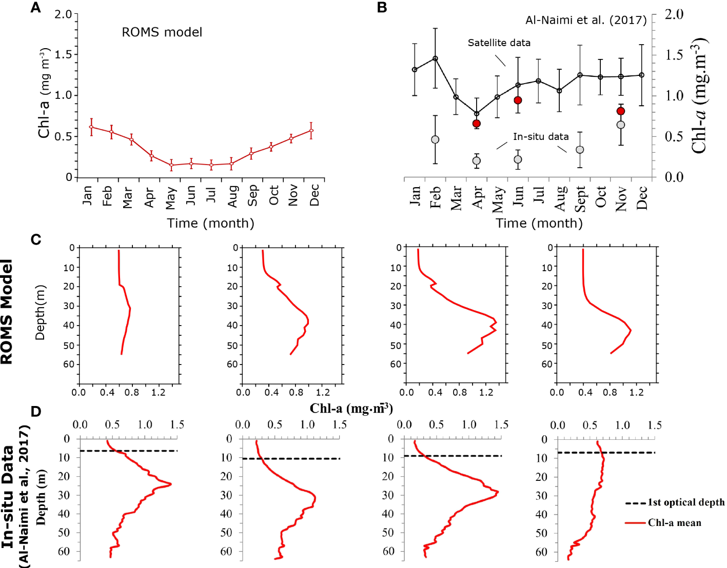 Evaluation of the model simulated chlorophyll-a concentrations (A, B) Seasonal surface Chl-a concentrations (in mg m-3) in the Qatar Exclusive Economic Zone (EEZ) (A) as simulated by ROMS and (B) from observations published by Al-Naimi et al. (2017). Gray circles show in-situ observations from six research cruises (2015-2016) while the black line indicates surface chl-a based on the OC-CCI satellite monthly climatology (1997-2013). (C, D) Vertical profiles of Chl-a in the Qatar EEZ in winter (DJF), spring (MAM), summer (JJA) and autumn (SON) seasons as simulated by (C) ROMS and (D) from in-situ measurements by Al-Naimi et al. (2017). Note that the seasonal in-situ chlorophyll profiles for winter, spring, summer and autumn are based on data collected in February 2016, April 2015/2016, June 2015, and September 2016/November 2015, respectively.
