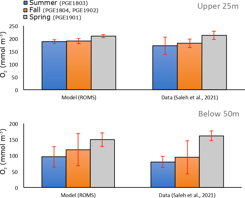 Evaluation of the model simulated dissolved O2 concentrations. O2 concentrations in the the Gulf (Iran EEZ) in late summer (blue), late autumn (orange) and spring (gray) as simulated by ROMS (left) and from observations collected during cruises PGE1803, PGE1804, PGE1901, and PGE1902 in 2018 and 2019 by Saleh et al. (2021) (right) in the upper 25m (top) and below 50m (bottom). Bar plots correspond to average concentrations for each season while error bars show standard deviations around the mean. For this comparison, the model was sampled at the observation points for each season.