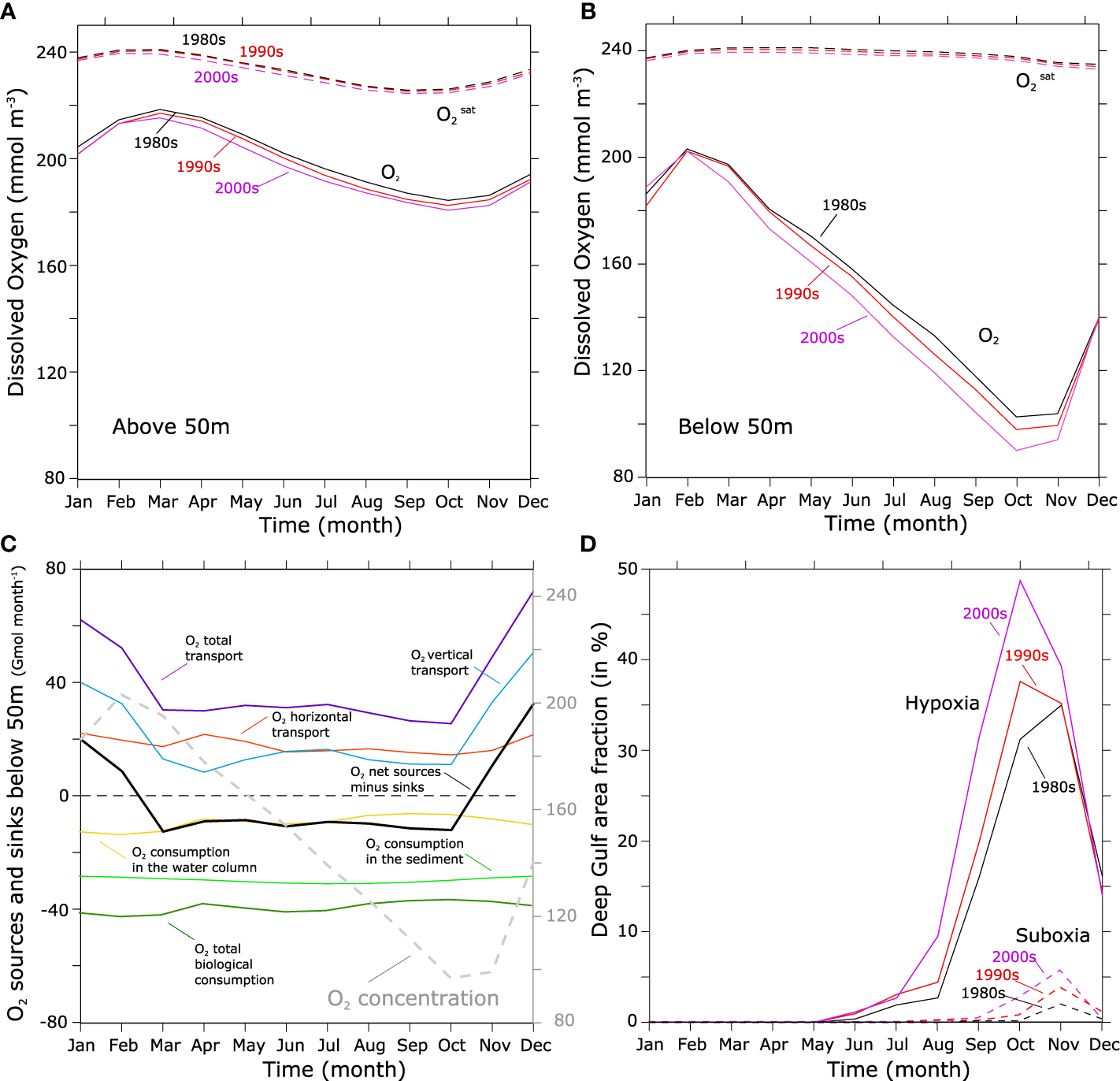 Seasonal variation in O2 and bottom hypoxia. (A, B) Average seasonal cycle in O2 (solid) and (dashed) in the 80s (black), 90s (red) and 2000s (purple) above 50m (A) and below 50m (B). (C) Seasonal variation in annual mean O2 concentrations (dashed gray line) and in physical and biological sources and sinks (solid lines) in the Gulf below 50 m. (D) hypoxic (O2< 60 mmol m-3) (solid) and suboxic (O2< 4 mmol m-3) (dashed) area fraction (in %) in the deep Gulf (bathymetry deeper than 50 m) in the 80s (black), 90s (red) and 2000s (purple).