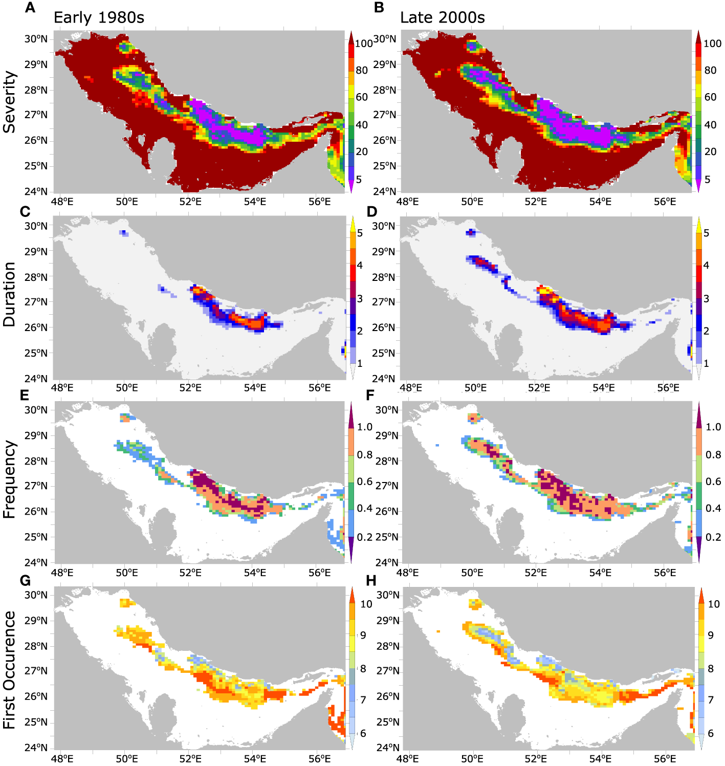 Evolution of the statistics of seasonal hypoxia in the Gulf between 1980s and 2000s. Annual near-bottom hypoxia (A, B) severity (i.e., O2 minimum concentration in mmol m-3), (C, D) total duration (in months), (E, F) frequency (number of hypoxic events per year), and (G, H) first occurrence (month of the year) in the early 1980s (1982-1986) (left) and late 2000s (2006-2010) (right).