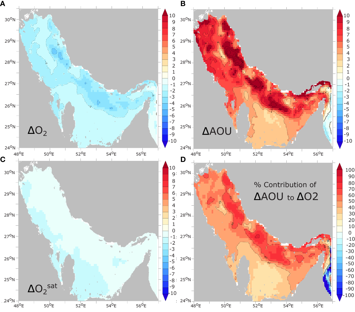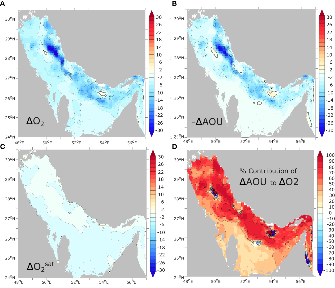 Contributions of solubility and AOU changes to near-bottom O2 changes. Change in annual mean near-bottom (deepest model sigma layer) (A) O2 concentrations and (B) -ΔAOU (), and (C) between 1982 and 2010 (in mmol m-3). (D) contribution of changes in AOU (-ΔAOU) to changes in near-bottom O2 (in %).
