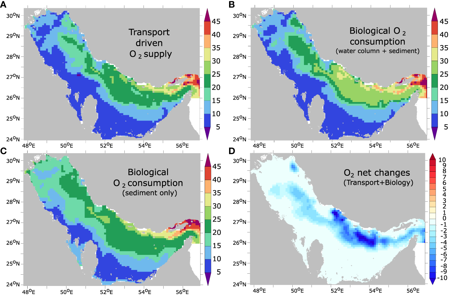 Because of the scarcity of physical and biogeochemical observations in the region (Al-Yamani and Naqvi, 2019), our understanding of the dynamics of hypoxia in the Gulf remains in its infancy. Indeed, the lack of observations not only limits our ability to understand the dynamics of the Gulf biogeochemical environment in general and the dynamics of O2 cycling in particular, but also severely hinders documenting long-term O2 trends in the Gulf in the context of a changing climate. Several modeling studies were conducted to compensate for the scarcity of observations in the Gulf (Chao et al., 1992; Kämpf and Sadrinasab, 2006; Yao and Johns, 2010a; Yao and Johns, 2010b; Thoppil and Hogan, 2010a; Thoppil and Hogan, 2010b; Pous et al., 2013; Pous et al., 2015; Al Azhar et al., 2016; Al-Shehhi et al., 2021). However, no modeling has yet been conducted to elucidate the biogeochemistry of the Gulf, as previous studies essentially focused only on the dynamics of the Gulf circulation and its the variability. Moreover, to the best of our knowledge, no previous work has explored the drivers of large-scale hypoxia in the Gulf and its seasonal and long-term variability.