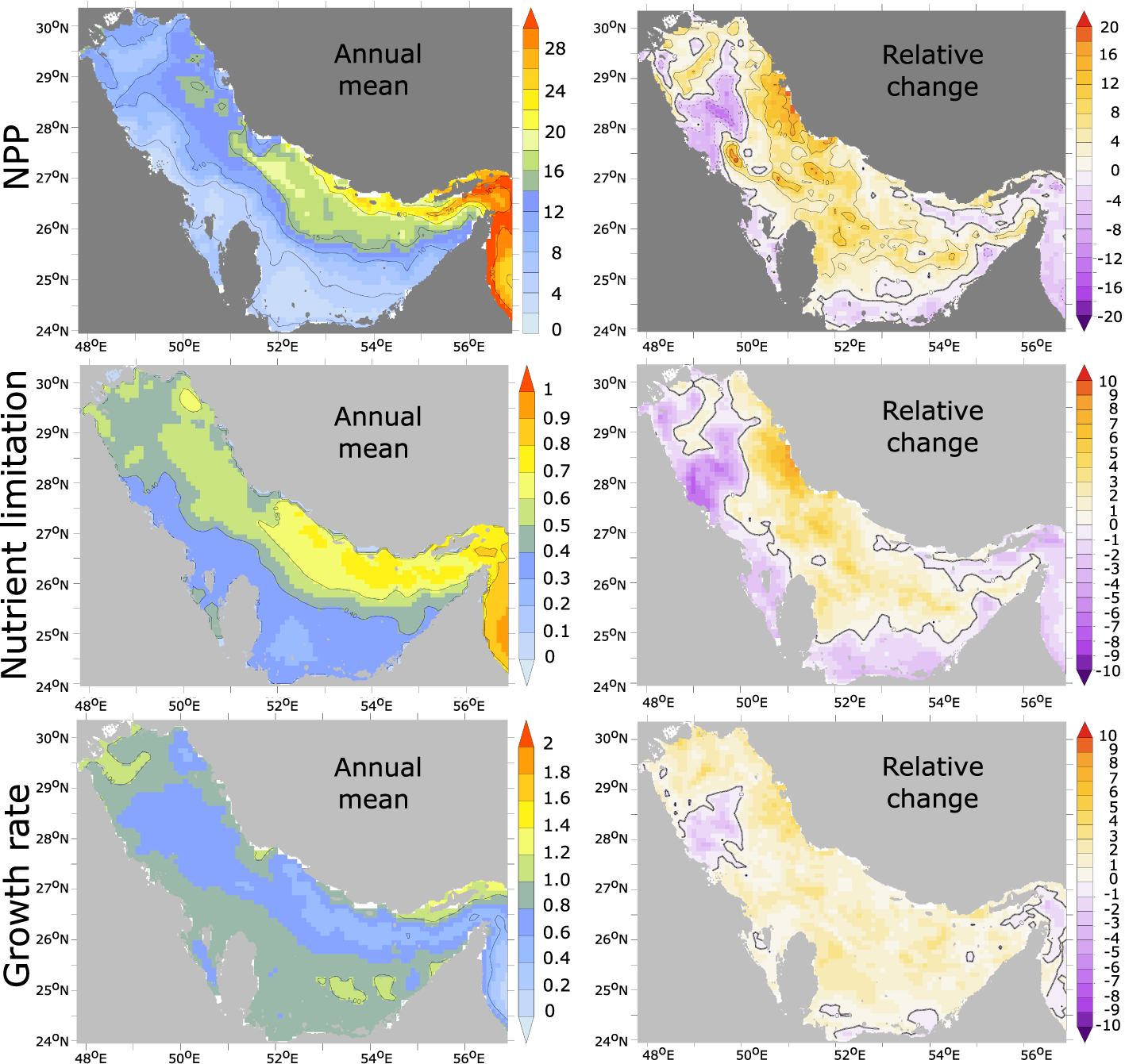 The prescribed main changes in the atmospheric conditions, namely the Gulf warming and changes in Shamal winds are relatively robust features across different data-based products (Figure S9 and S13, S1). However, the simulated changes in productivity and nutrient supply to the Gulf remain to be confirmed by in-situ observations. In particular, repeated measurements of key physical parameters such as the intensity and structure of the water exchange through the Strait of Hormuz and important biological parameters such as chlorophyll and nutrient concentrations are essential to documenting ongoing changes and confirming the mechanisms described in our modeling study.