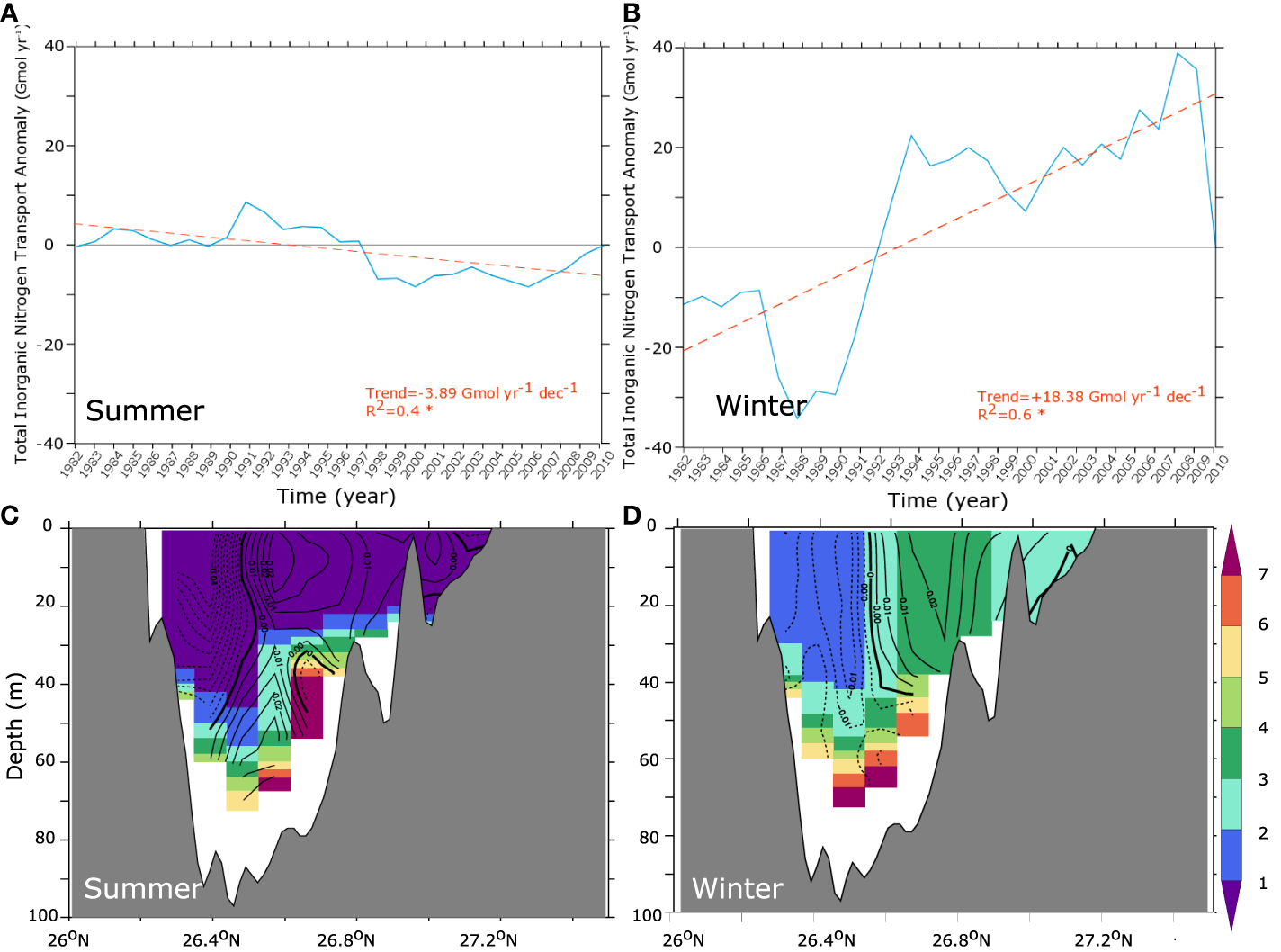 Changes in the Gulf nutrient inflow. (A, B) Cumulative anomalies of total transport of TIN across the Strait of Hormuz between 1982 and 2010 in the upper 40 m in summer (A) and winter (B) (trend lines are shown in orange). (C, D) Average TIN (color shading, in mmol m-3) and change in water velocities through the Strait of Hormuz (contour lines, in m s-1; inflow positive) between the early 1980s and the late 2000s in summer (C) and winter (D).