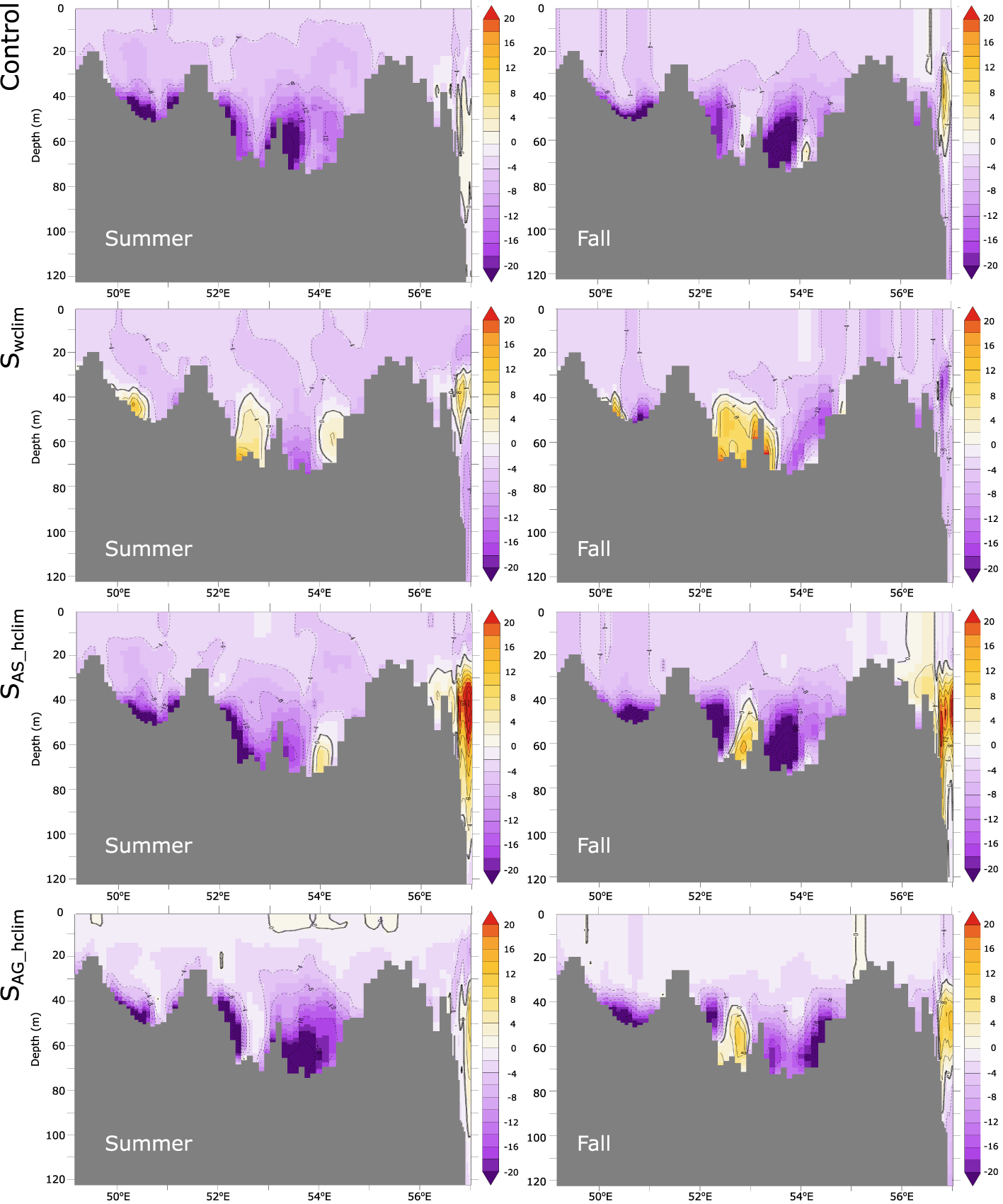 O2 changes along the Gulf axis in the control and under different atmospheric forcing scenarios. O2 changes between the early 1980s and the late 2000s along the Gulf axis (shown in Figure S1) in summer (left) and autumn (right) as simulated in the control (top), in absence of wind changes (i.e., Swclim) (row 2), in absence of warming over the Arabian Sea (i.e., SAS_hclim) (row 3) and in absence of Gulf warming (i.e., SAG_hclim) (bottom).