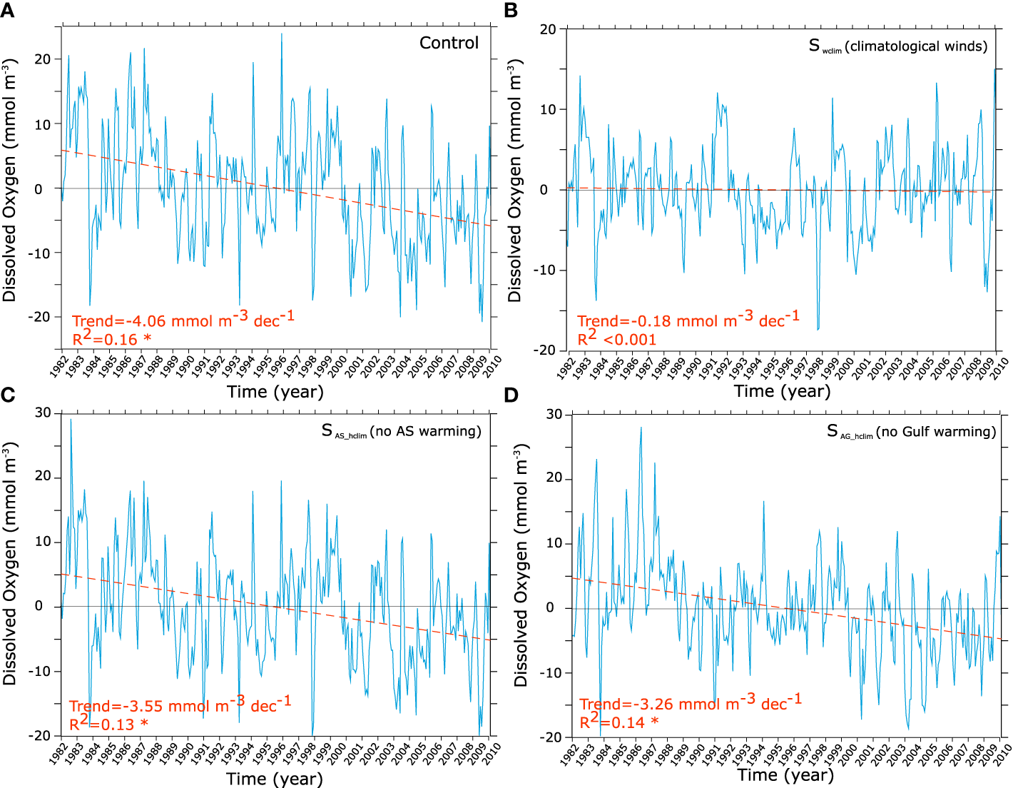 O2 trends in the control and under different atmospheric forcing scenarios. O2 interannual anomalies and trends in the deep Gulf (bathymetry > 40 m) as simulated in the control (A), in absence of wind changes (i.e., Swclim) (B), in absence of warming over the Arabian Sea (i.e., SAS_hclim) (C) and in absence of Gulf warming (i.e., SAG_hclim) (D).