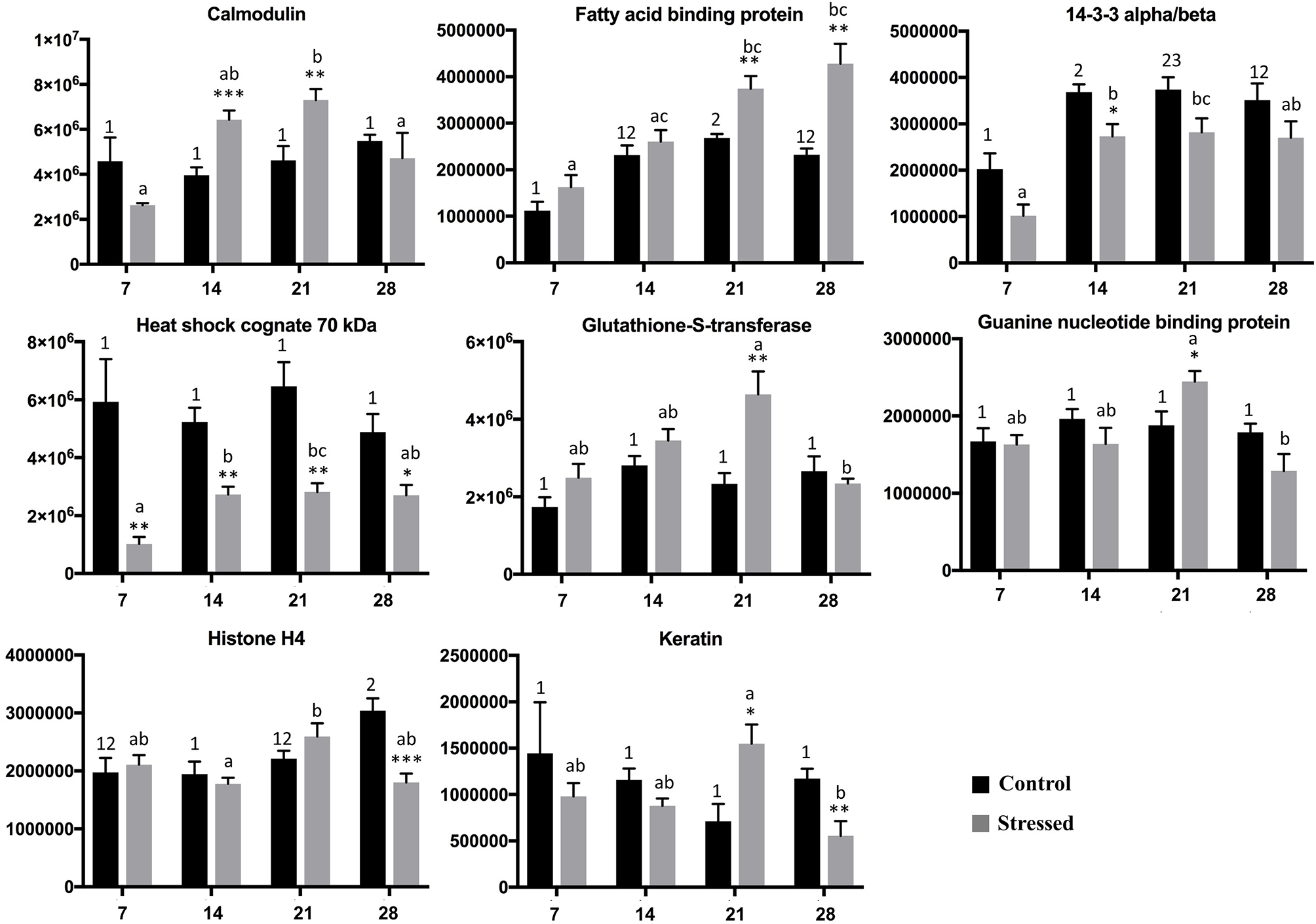 Protein spot intensities of identified proteins in control and stressed group. Protein spot intensities given by PDQuest (Y-axis) during the course of the experiment measured on day 7, 14, 21, and 28 (X-axis). Error bar shows error of mean (p < 0.05, n = 6). Letters signifies the difference in expression between the stressed group and number signifies the difference in expression between the control group along the course of experiment at different time points (One way Annova and Tukey HSD post hoc analysis; Kruskal Walli’s test and Dunn’s test for nonparametric data). The same number/letters shows no difference and different number/letters indicates a difference. Asterisk shows the comparison between the control and stressed fish at each time point (unpaired t-test for data that showed normal distribution and Mann Whitney U test for data that did not show normal distribution).