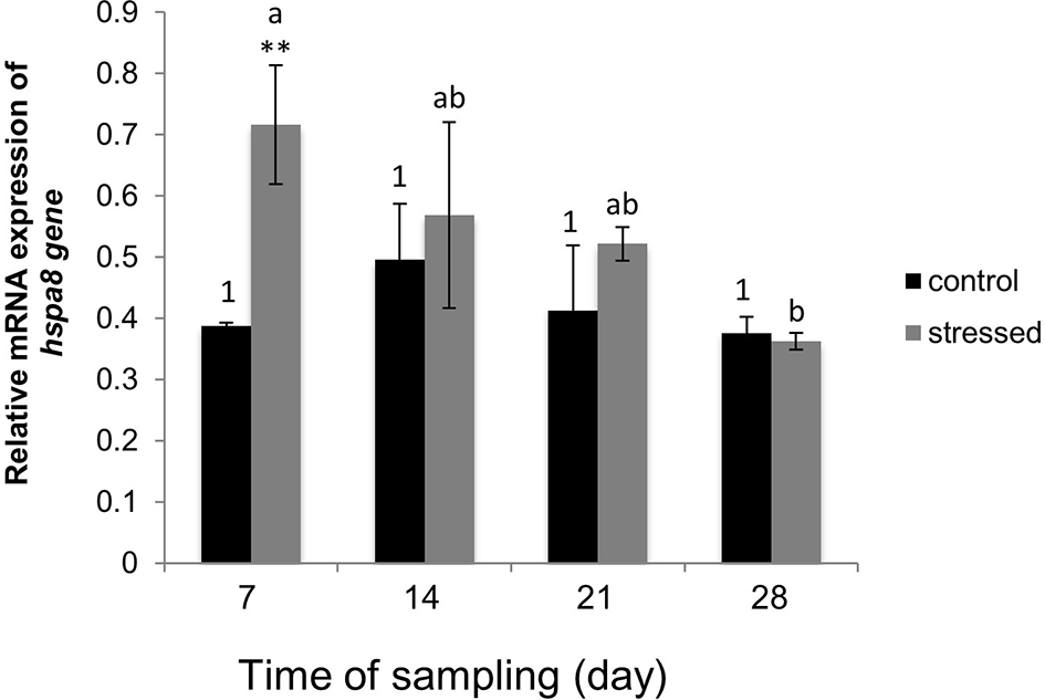 Relative mRNA expression of hspa8 gene. The expression is relative to the geometric mean of two reference genes beta-actin and gapdh (glyceraldehyde 3-phosphate dehydrogenase). Asterisk denote a significant difference between the control and stressed group on day 7. The letters refers to the changes in expression between the stressed group on day 7 till 28. The number shows difference in expression between the control groups on day 7 till 28. The same letters and number means no change and different ltters and numbers indicate significant differences. Error bar shows error of the mean, n = 5, p < 0.05. Details about statistical analysis are mentioned in the statistic description in the Materials and Methods.