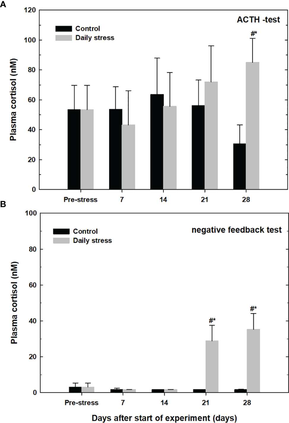 The resting levels of plasma cortisol in the no-stress (control) group did not change during the experimental period (Figure 1). The resting plasma cortisol increased in the daily stress group and was significantly elevated compared with pre-stress and control groups at the same sampling time at 21 (25.3 ± 10.1 nM) and 28 (22.5 ± 14.1 nM) days after start of the experiment.