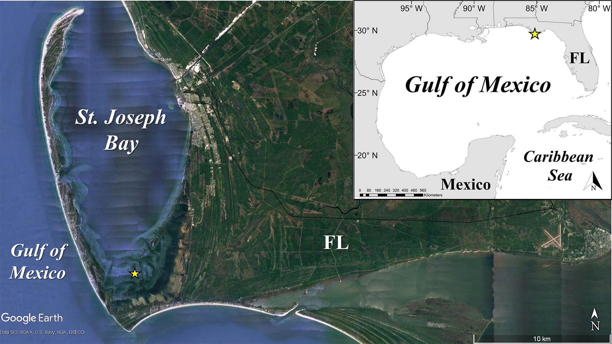 Study area in St. Joseph Bay, Florida in the northeastern Gulf of Mexico. Experimental array (yellow star) is located in the southern turtlegrass beds of St. Joseph Bay.