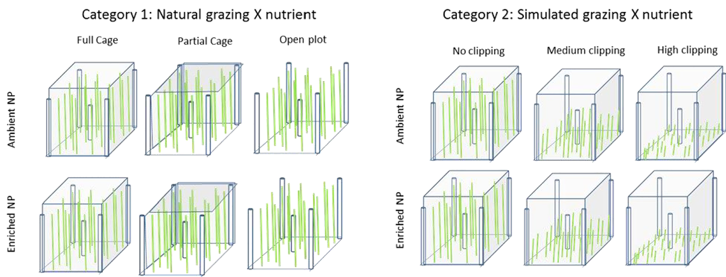 Graphical representation of treatments (n=5) established at our study site. Treatments included two broad categories: natural grazing (full cages, partial cages and uncaged plots) x fertilization; and simulated grazing (no clip, half clip and full clip) x fertilization.