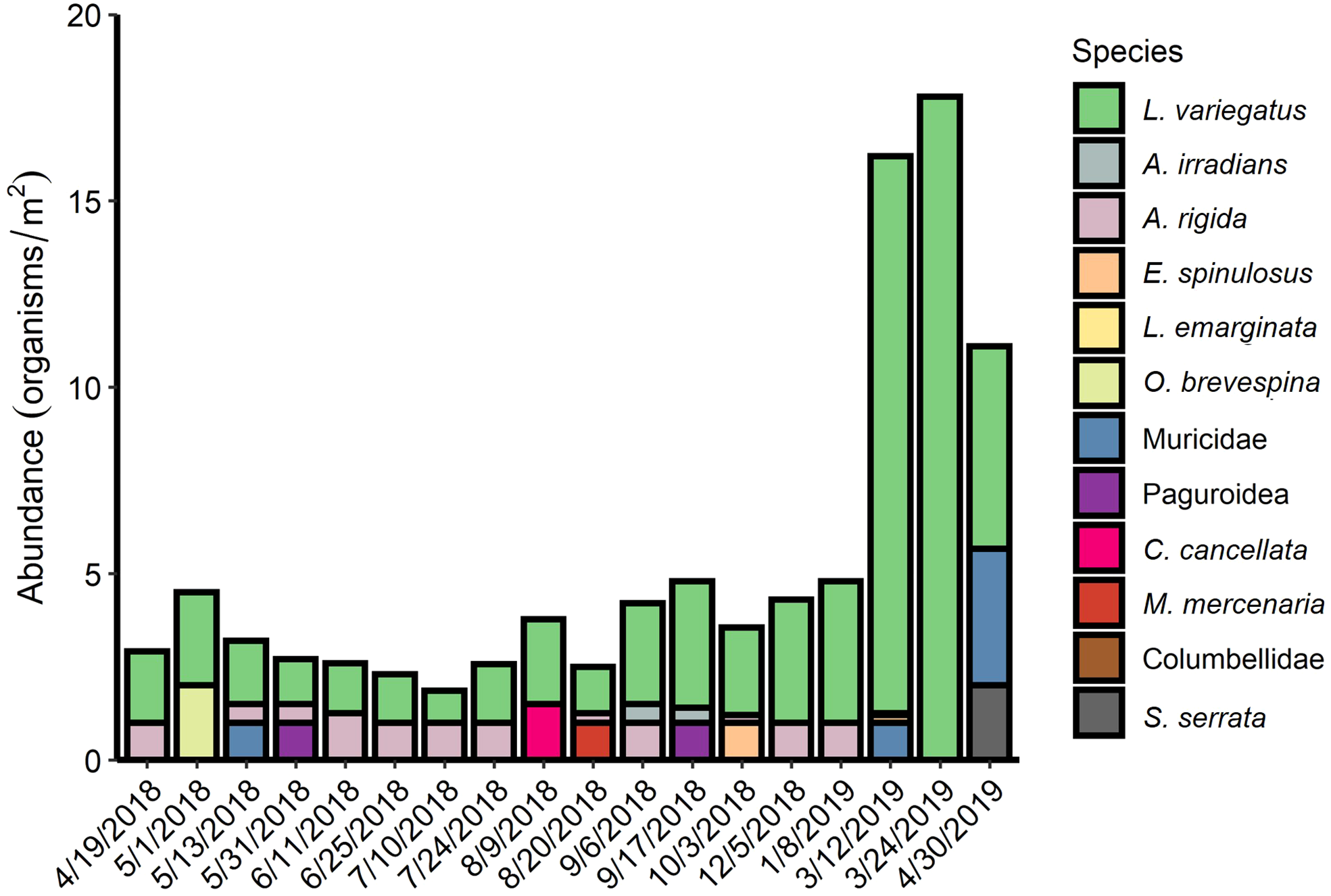 An unanticipated massive recruitment of the variegated sea urchin, a species known for episodic recruitment in Gulf of Mexico seagrass meadows (Camp et al., 1973; Rose et al., 1999; Peterson et al., 2002), and a common resident consumer of turtlegrass in the GOM and the Caribbean (Vadas and Fenchel, 1982; Valentine et al., 1997), occurred during our study. The results of this large increase in the abundance of seagrass-consuming urchins and their breaching of experimental exclosures was first noted in late February and brought a premature end to our experiment.